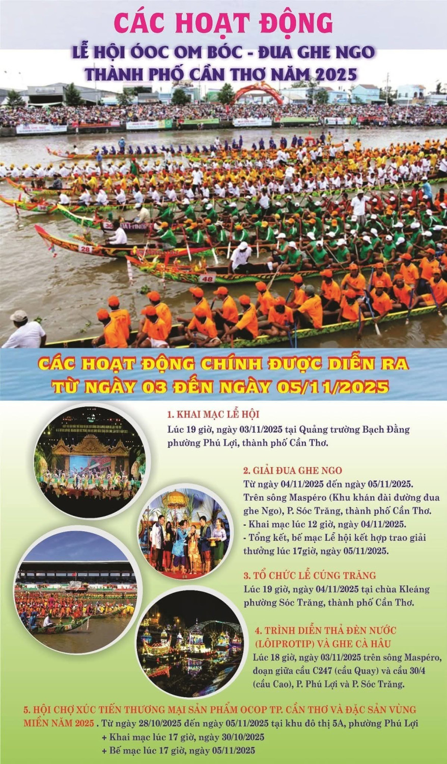 Lễ hội Oóc Om Bóc - Đua ghe Ngo thành phố Cần Thơ năm 2025 được diễn ra từ ngày 03 đến ngày 05/11 trên địa bàn phường Phú Lợi và phường Sóc Trăng, thành phố Cần Thơ với nhiều hoạt động như: Lễ Khai mạc Lễ hội, Giải đua ghe Ngo, trình diễn thả Đèn nước (Lôiprotip) và ghe Cà Hâu, Lễ Cúng Trăng, hội chợ xúc tiến thương mại OCOP thành phố Cần Thơ và đặc sản vùng miền năm 2025 cùng nhiều hoạt động khác.
