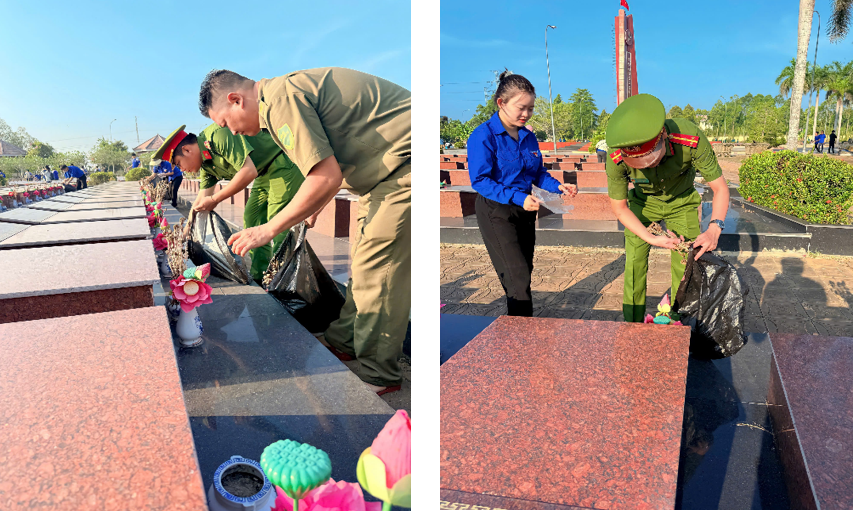 Trong buổi ra quân, đoàn viên, thanh niên Chi đoàn đã tiến hành dọn dẹp vệ sinh khuôn viên nghĩa trang, phát quang cỏ dại, thu gom rác thải, lau dọn các phần mộ liệt sĩ, chỉnh trang cảnh quan khu tưởng niệm. Với tinh thần trách nhiệm, nhiệt huyết của tuổi trẻ lực lượng Công an nhân dân, các hoạt động được triển khai nghiêm túc, đảm bảo xanh - sạch - đẹp, góp phần tạo không gian trang nghiêm, sạch sẽ tại nơi an nghỉ của các anh hùng liệt sĩ.