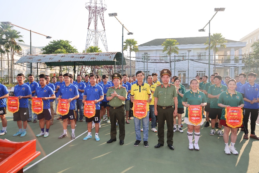 Đại tá Nguyễn Văn Thắng, Phó Giám đốc Công an thành phố trao cờ lưu niệm cho các đơn vị tham gia Hội thao