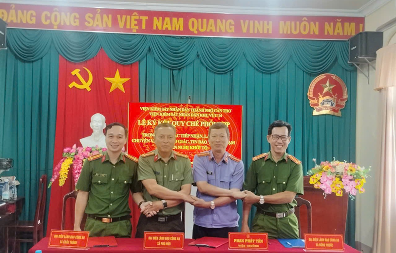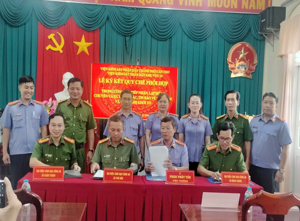 Ngày 21/11/2025, tại trụ sở Viện kiểm sát nhân dân khu vực 14, thành phố Cần Thơ, Công an các xã Đông Phước, Châu Thành, Phú Hữu đã phối hợp Viện kiểm sát nhân dân khu vực 14 tổ chức Lễ ký kết Quy chế phối hợp trong công tác tiếp nhận, lập hồ sơ chuyển và xử lý tố giác, tin báo về tội phạm, kiến nghị khởi tố.
