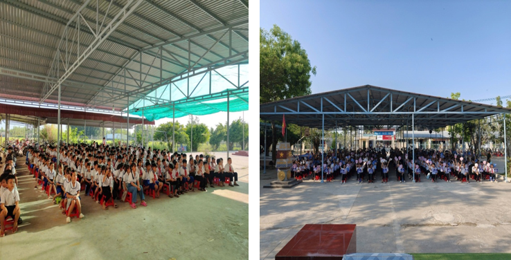 Ảnh: Quang cảnh buổi tuyên truyền tại Trường Tiểu học Huỳnh Hữu Nghĩa B và Trường Trung học cơ sở Huỳnh Hữu Nghĩa.