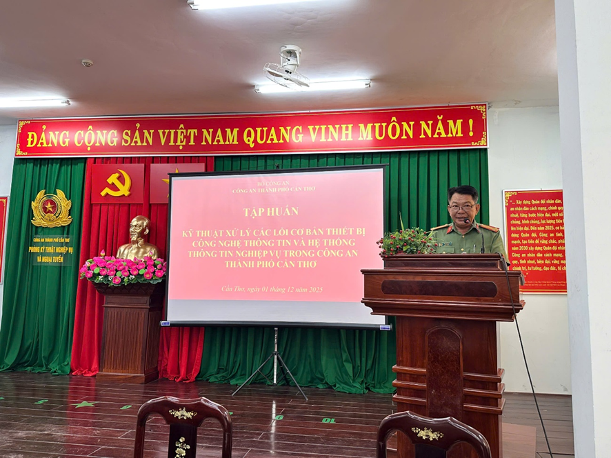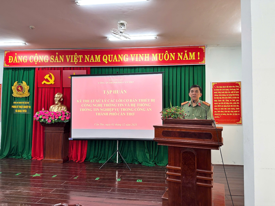 Ngày 01/12/2025, Công an thành phố Cần Thơ tổ chức tập huấn kỹ thuật xử lý các lỗi cơ bản thiết bị công nghệ thông tin và hệ thống thông tin nghiệp vụ nhằm hướng dẫn, trang bị cho cán bộ, chiến sĩ Công an xã, phường, Đồn Công an những kiến thức cơ bản về công nghệ thông tin, các hệ thống thông tin nghiệp vụ trong Công an thành phố, qua đó nắm vững nguyên lý hoạt động, kỹ năng xử lý, khắc phục được các lỗi thường gặp trong quá trình khai thác, sử dụng góp phần nâng cao hiệu quả công tác trong thời gian tới. Đến dự buổi tập huấn có đồng chí Thượng tá Trần Bình Minh, Phó Bí thư Đảng ủy, Phó Trưởng phòng Tham mưu; bộ phận chuyên trách về lĩnh vực công nghệ thông tin Công an thành phố là báo cáo viên và hơn 100 cán bộ, chiến sĩ được giao nhiệm vụ kiêm nhiệm công tác công nghệ thông tin tại Công an xã, phường, Đồn Công an.