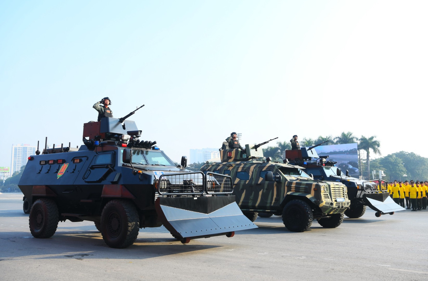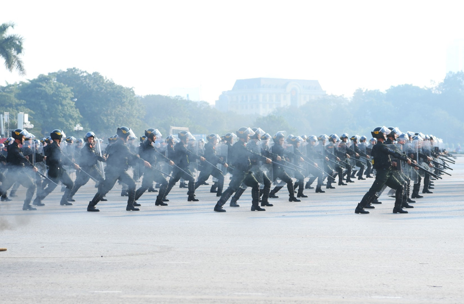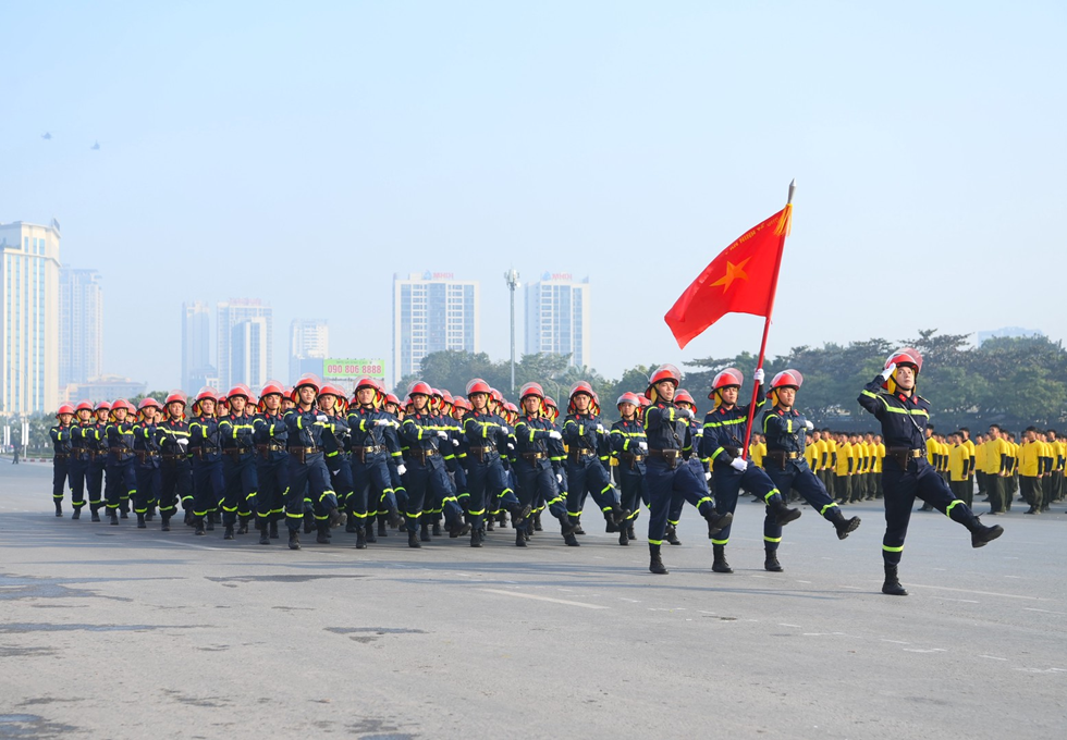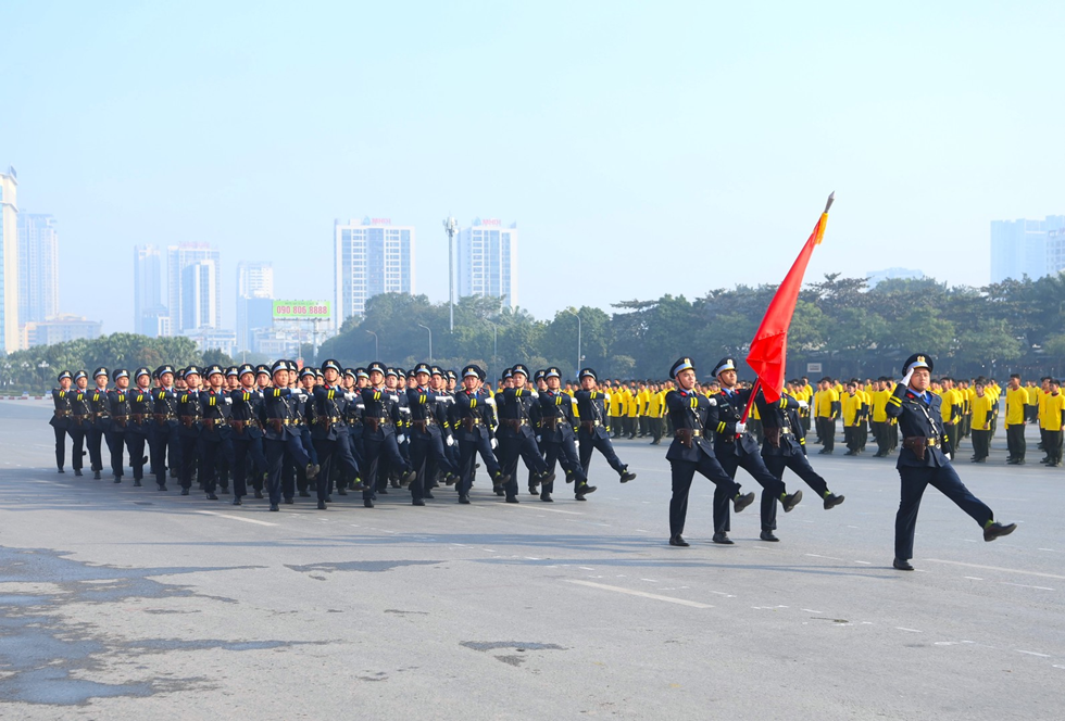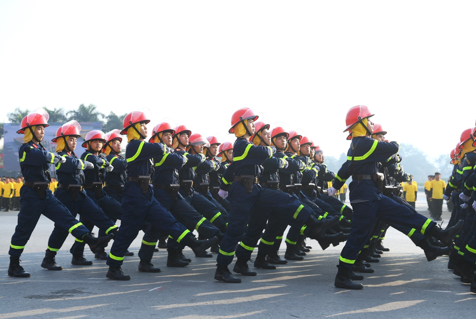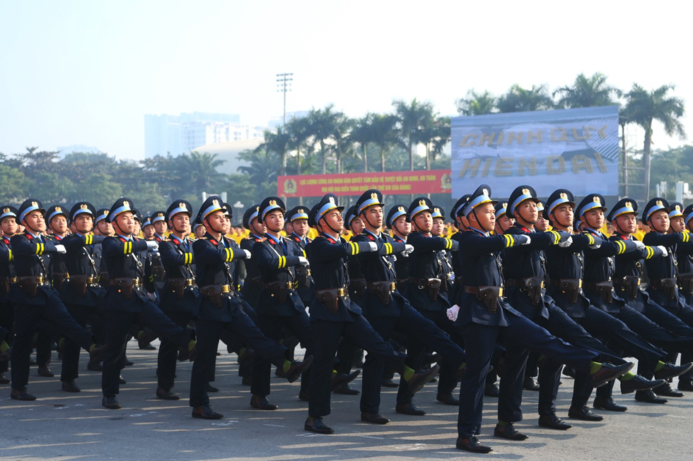 Ngay sau đó là chương trình duyệt đội ngũ, diễu hành phương tiện đặc chủng của Bộ Công an và lực lượng trực thăng thuộc Trung đoàn Không quan 916, Sư đoàn Không quân 371, Quân chủng Phòng không – Không quân – Bộ Quốc phòng; báo cáo kết quả huấn luyện các nội dung thực hiện phương án bảo đảm ANTT với các nội dung đồng diễn Bài Quyền dùi cui, lá chắn, nội dung khí công, công phá, bắn súng ứng dụng…