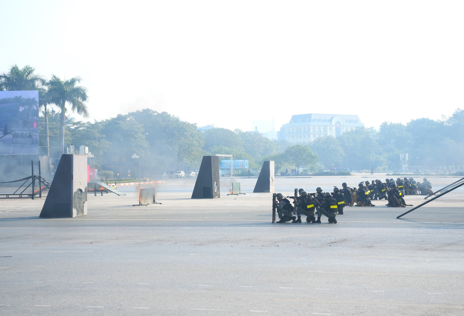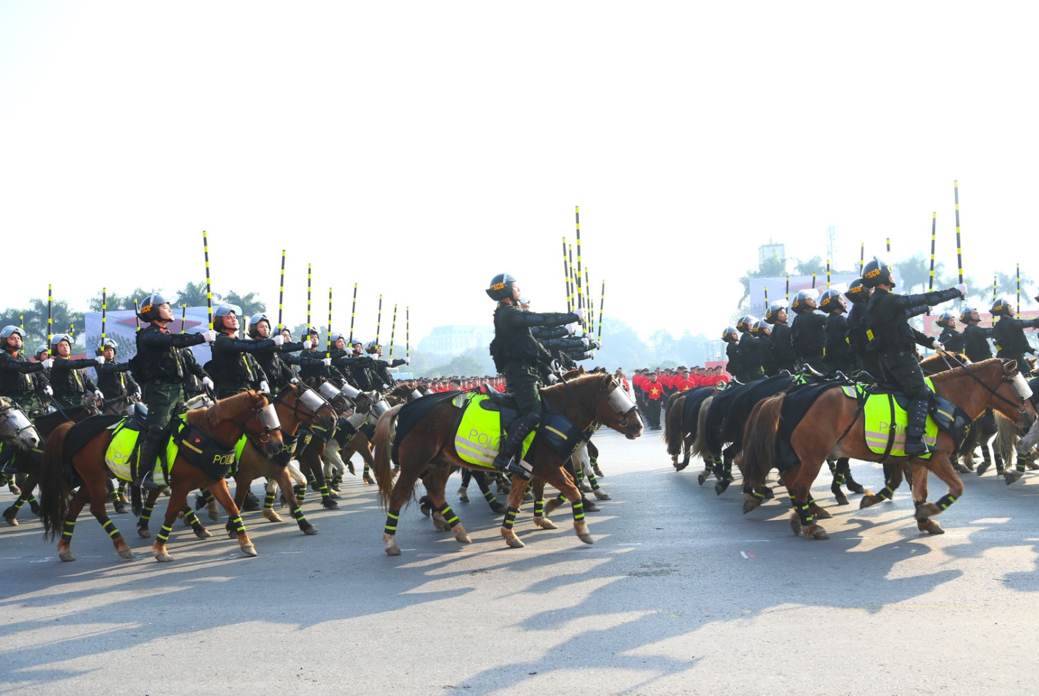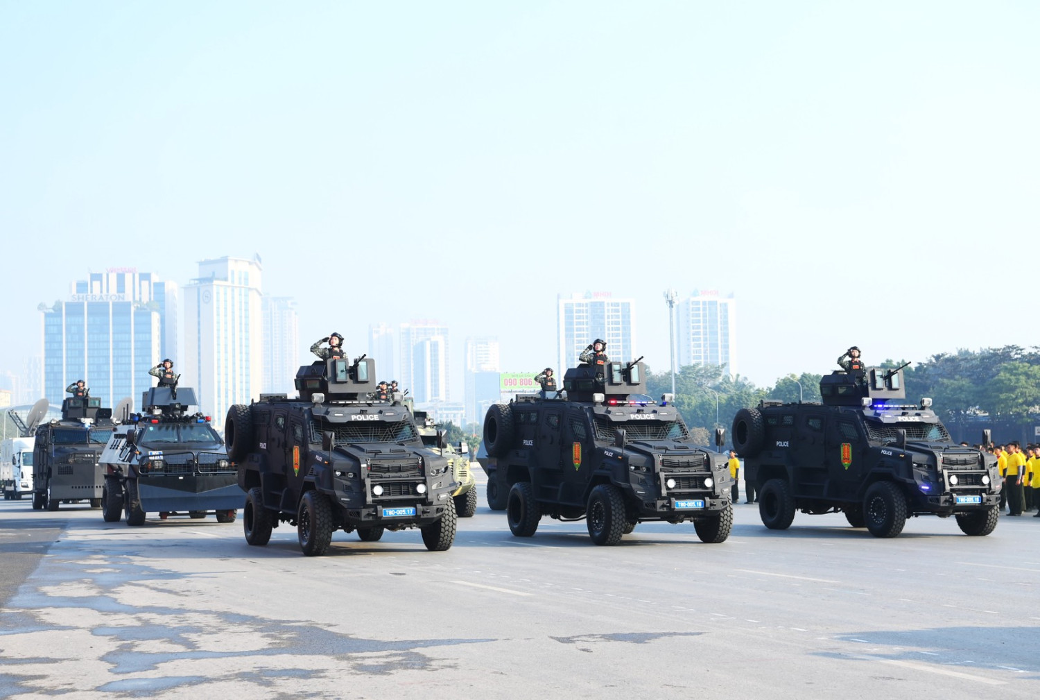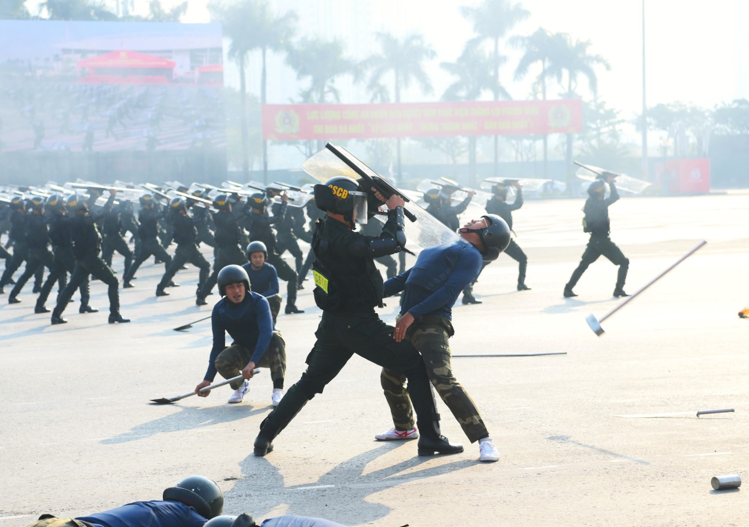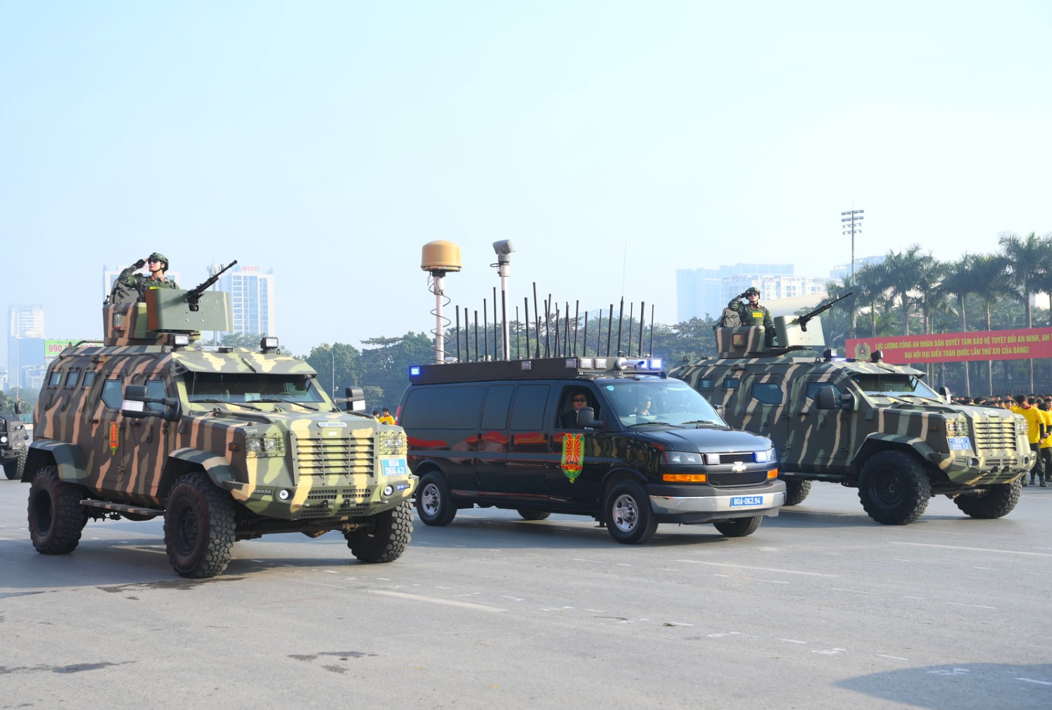 Ngay sau đó là chương trình duyệt đội ngũ, diễu hành phương tiện đặc chủng của Bộ Công an và lực lượng trực thăng thuộc Trung đoàn Không quan 916, Sư đoàn Không quân 371, Quân chủng Phòng không – Không quân – Bộ Quốc phòng; báo cáo kết quả huấn luyện các nội dung thực hiện phương án bảo đảm ANTT với các nội dung đồng diễn Bài Quyền dùi cui, lá chắn, nội dung khí công, công phá, bắn súng ứng dụng…