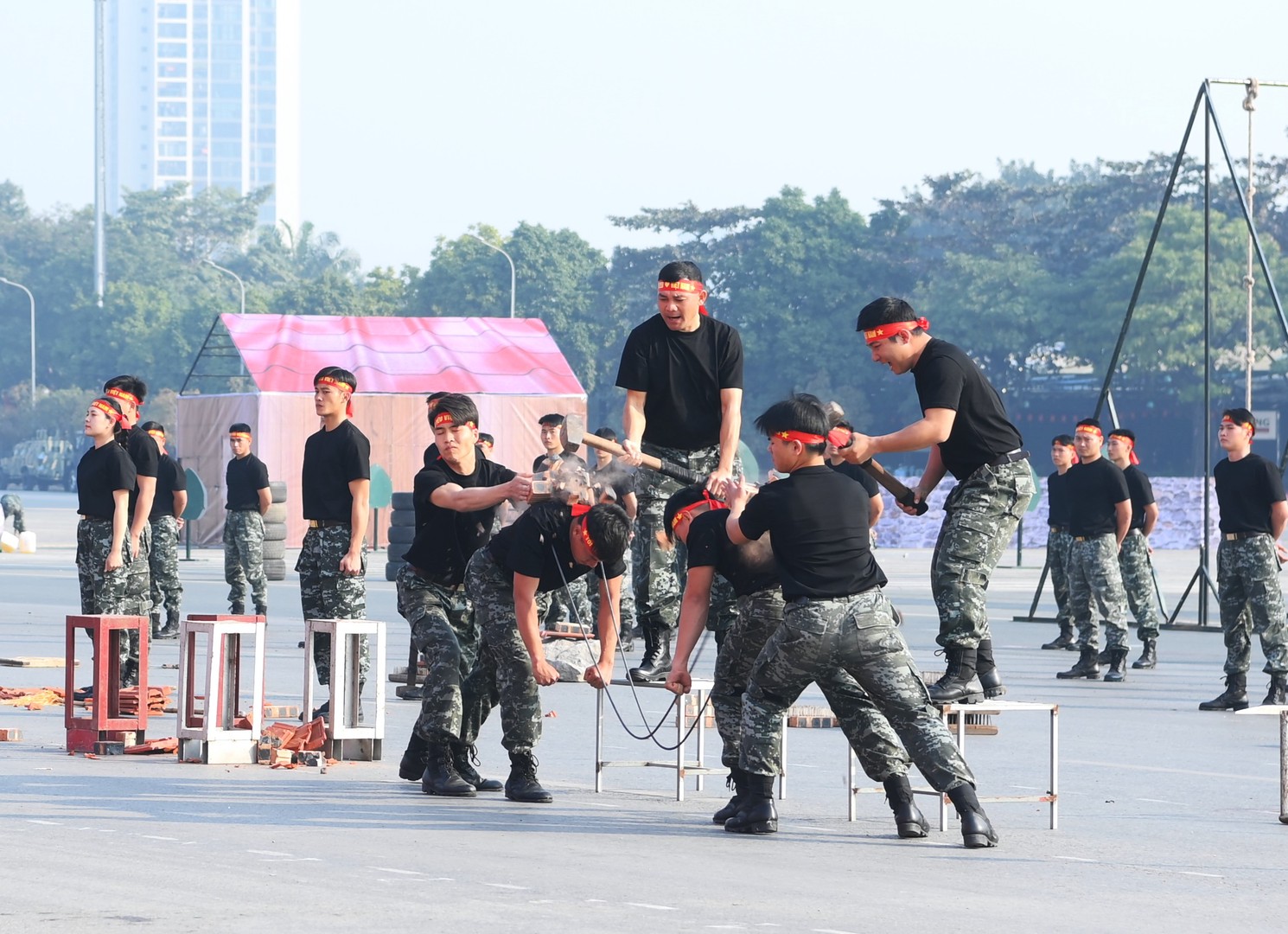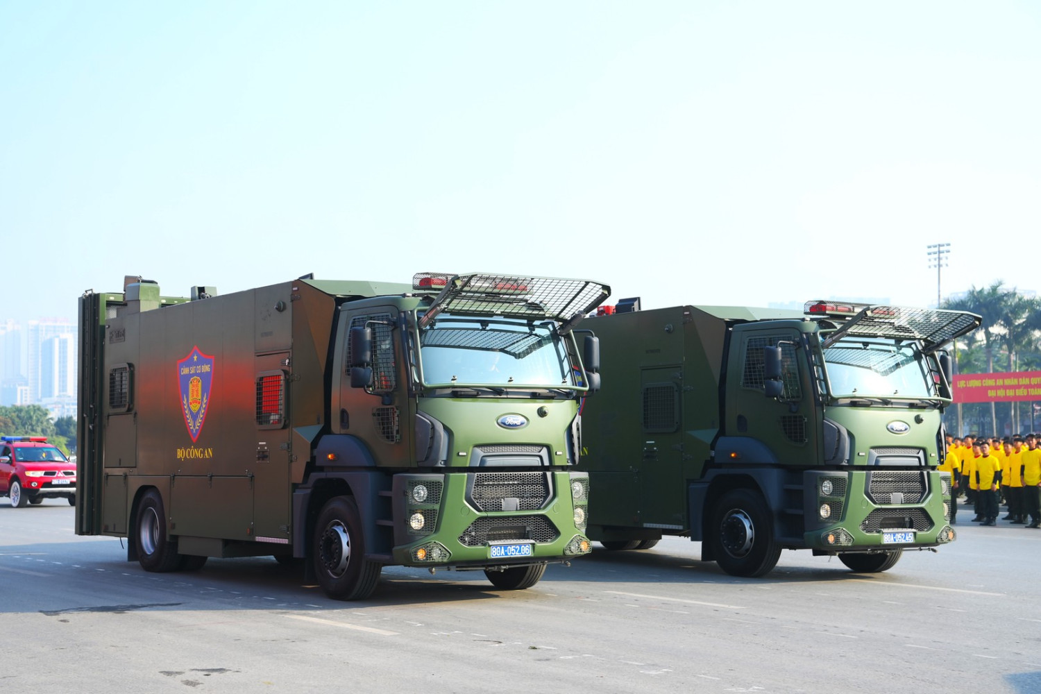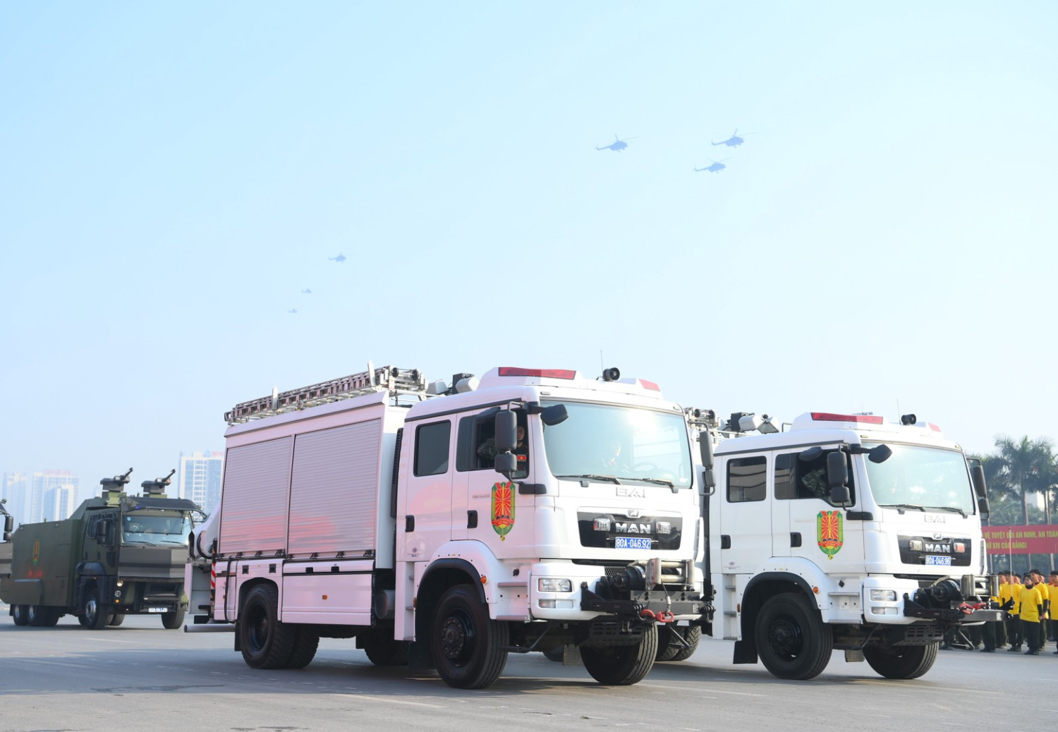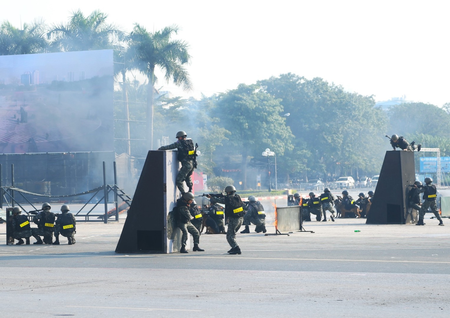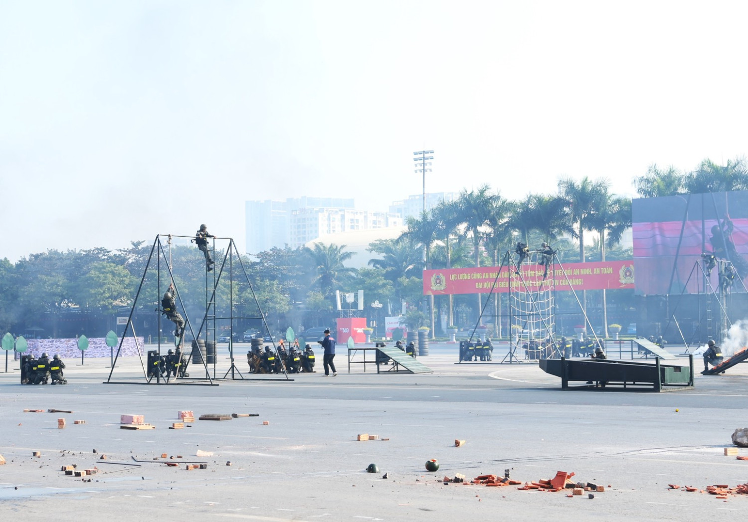 Ngay sau đó là chương trình duyệt đội ngũ, diễu hành phương tiện đặc chủng của Bộ Công an và lực lượng trực thăng thuộc Trung đoàn Không quan 916, Sư đoàn Không quân 371, Quân chủng Phòng không – Không quân – Bộ Quốc phòng; báo cáo kết quả huấn luyện các nội dung thực hiện phương án bảo đảm ANTT với các nội dung đồng diễn Bài Quyền dùi cui, lá chắn, nội dung khí công, công phá, bắn súng ứng dụng…