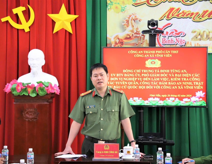 Phát biểu tại buổi làm việc, Trung tá Đinh Tùng An - Phó Giám đốc Công an TP Cần Thơghi nhận và biểu dương những nỗ lực và kết quả công tác của Công an các xã trong việc giữ vững an ninh địa bàn, đặc biệt là tinh thần quyết liệt trong tấn công, trấn áp tội phạm dịp Tết Nguyên đán Bính Ngọ 2026.