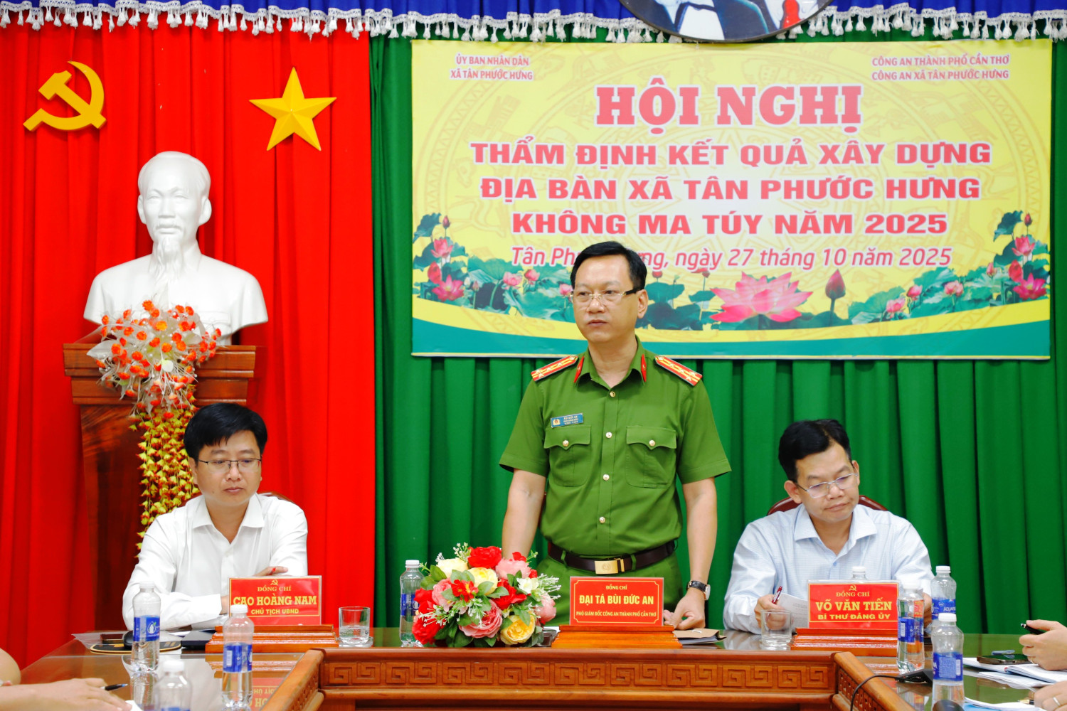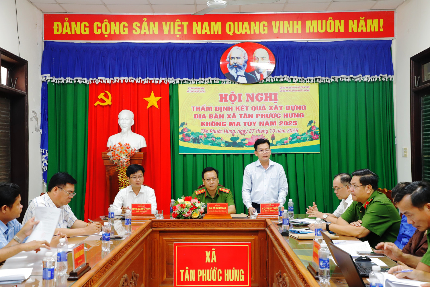 Ngày 27/10/2025, Đoàn thẩm định Hội đồng thành phố xét duyệt địa bàn xã, phường không ma túy và đề nghị xét duyệt địa bàn thành phố không ma túy (sau đây gọi tắt là Đoàn thẩm định) do Đại tá Bùi Đức An, Phó Giám đốc Công an thành phố, Phó Chủ tịch Hội đồng làm trưởng đoàn đã tiến hành thẩm định kết quả triển khai thực hiện xã Tân Phước Hưng.