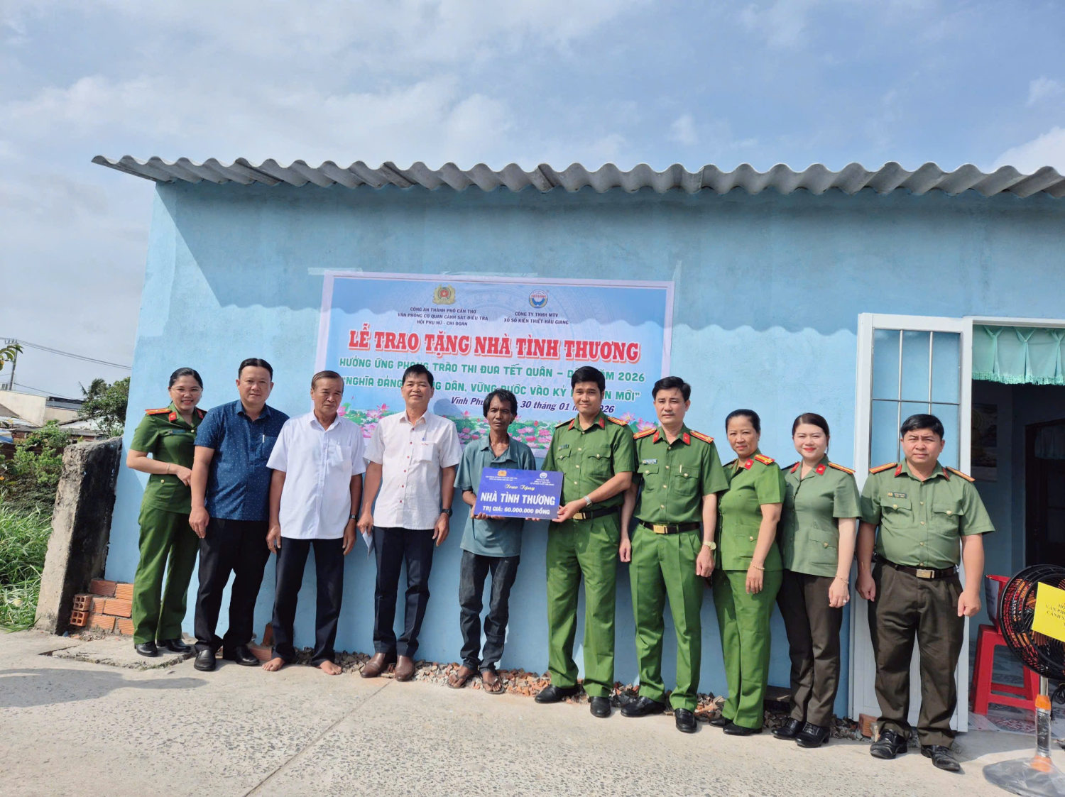 Thiết thực hưởng ứng phong trào thi đua Tết Quân - Dân năm 2026 với chủ đề “Nghĩa Đảng - Lòng Dân, vững bước vào kỷ nguyên mới” và phong trào thi đua “Ba nhất” trong lực lượng Công an nhân dân. Được sự quan tâm, chỉ đạo, tạo điều kiện của Đảng ủy, lãnh đạo đơn vị, ngày 30/01, Hội Phụ nữ - Chi đoàn Văn phòng Cơ quan Cảnh sát điều tra, Công an thành phố Cần Thơ phối hợp với chính quyền địa phương tổ chức Lễ trao tặng nhà tình thương cho hộ ông Tăng Liên, ngụ khu vực Wath Pich, phường Vĩnh Phước, thành phố Cần Thơ.
