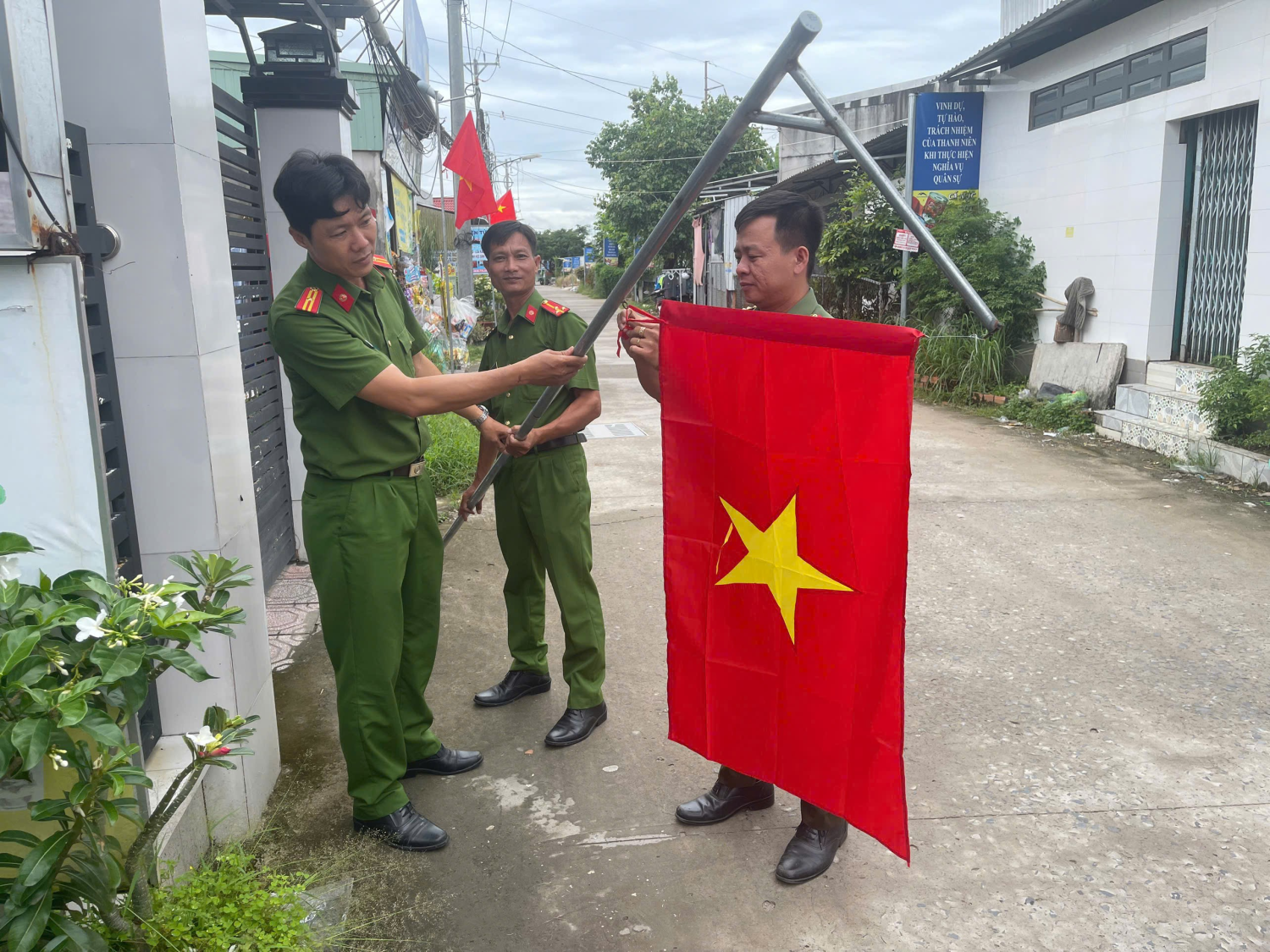Đoàn viên, chiến sĩ Công an phường Thới Long tích cực tham gia lắp đặt cột cờ Tổ quốc