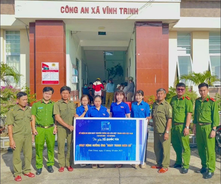 Tại xã Vĩnh Trinh, Đoàn Thanh niên Công an xã phối hợp với Xã Đoàn tổ chức ra quân thực hiện “Ngày Thanh niên số”. Trong hoạt động này, Đoàn Thanh niên Công an xã đã tuyên truyền và treo 50 bảng thông tin “Đường dây nóng liên hệ Công an xã Vĩnh Trinh tố giác tội phạm”, đồng thời giới thiệu các kênh tiếp nhận phản ánh của người dân qua fanpage Công an xã và số điện thoại 02923.859.108, hoạt động 24/24 để tiếp nhận thông tin về an ninh trật tự, tin báo và tố giác tội phạm.