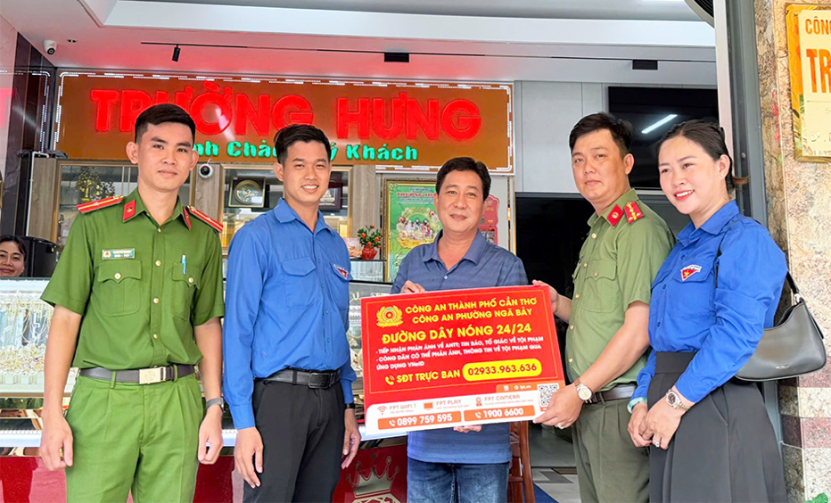 Công an phường Ngã Bảy và Đoàn phường trao bảng thông tin đường dây nóng cho hộ kinh doanh để treo trước cửa, kịp thời thông tin về tình hình an ninh, trật tự