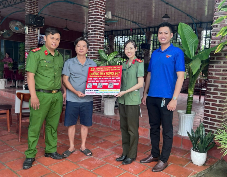 Đoàn viên, thanh niên Công an phường Đại Thành hướng dẫn người dân thực hiện mô hình “Số điện thoại đường dây nóng và Hộp thư điện tử tố giác tội phạm”