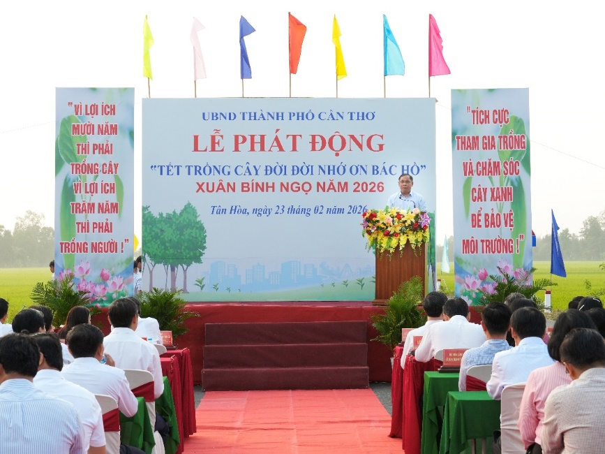 Phát biểu phát động, ông Trần Chí Hùng, Phó Chủ tịch UBND thành phố đề nghị các cấp ủy Đảng, chính quyền, Mặt trận Tổ quốc, các đoàn thể chính trị - xã hội, sở, ban, ngành và địa phương tiếp tục đẩy mạnh tuyên truyền sâu rộng về ý nghĩa của việc trồng, bảo vệ cây xanh; tổ chức phong trào thiết thực, hiệu quả, tiết kiệm, gắn với xây dựng nông thôn mới, chỉnh trang đô thị, nâng cao ý thức bảo vệ môi trường trong cộng đồng. Phó Chủ tịch UBND thành phố kêu gọi toàn thể cán bộ, công chức, viên chức, đoàn viên, hội viên, lực lượng vũ trang và nhân dân tích cực hưởng ứng phong trào; mỗi người trồng thêm một cây xanh, mỗi cơ quan, đơn vị, khu dân cư xây dựng thêm một mảng xanh, góp phần để Cần Thơ ngày càng xanh hơn, đẹp hơn, đáng sống hơn.