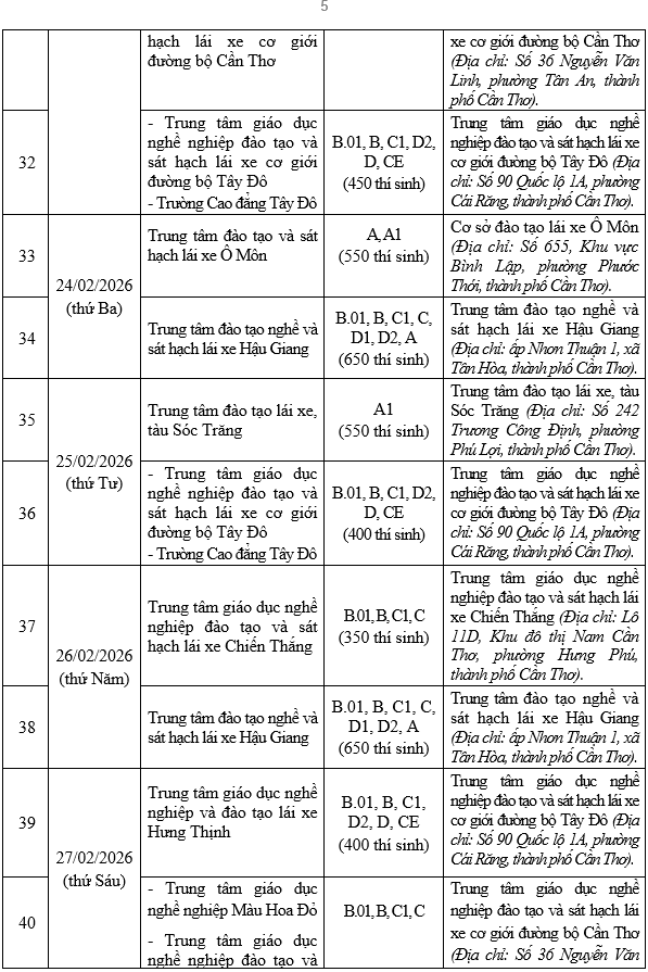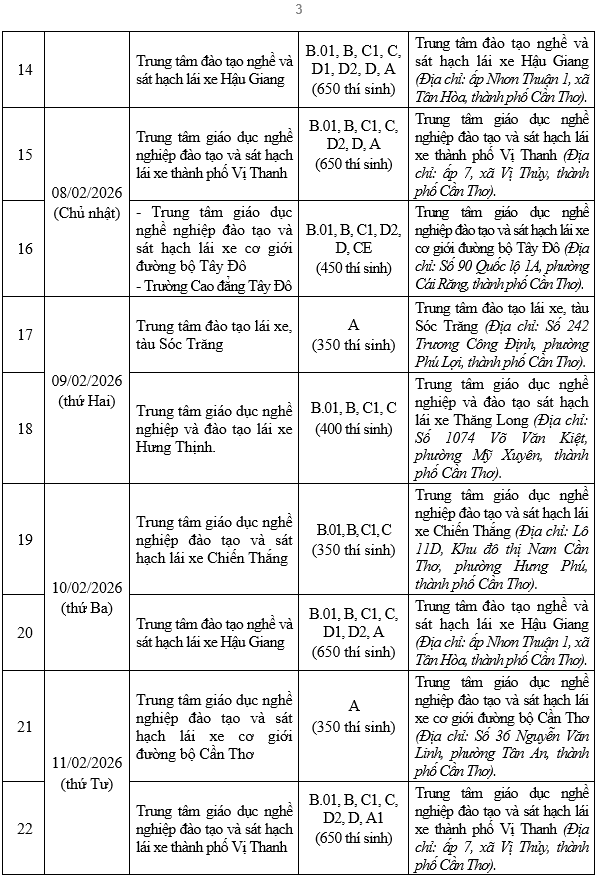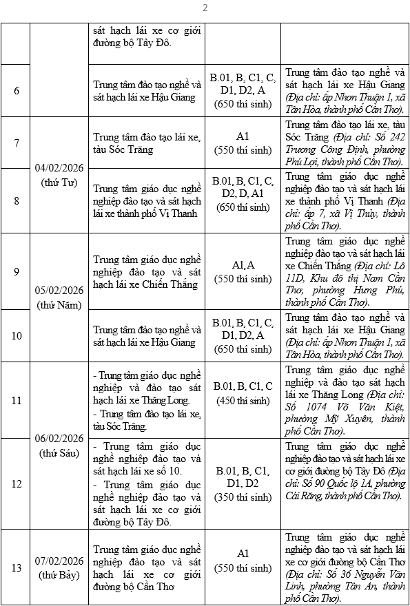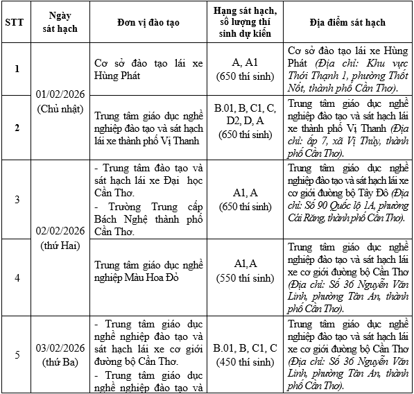 Thực hiện Thông tư số 12/2025/TT-BCA, ngày 28/02/2025 của Bộ trưởng Bộ Công an quy định về sát hạch, cấp giấy phép lái xe, cấp, sử dụng giấy phép lái xe quốc tế; Căn cứ đề nghị sát hạch lái xe của các Cơ sở đào tạo, sát hạch lái xe, Phòng Cảnh sát giao thông Công an thành phố Cần Thơ thông báo lịch tổ chức sát hạch, lái xe ô tô, mô tô trong tháng 02/2026 như sau:
