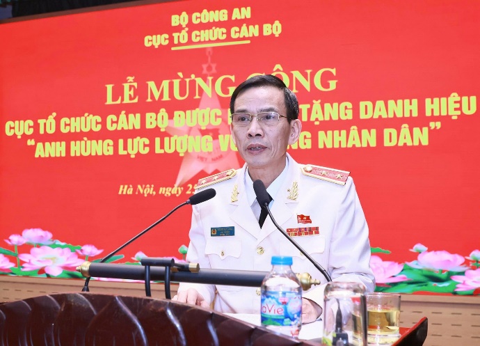 Đồng chí Cục trưởng nhấn mạnh, danh hiệu Anh hùng lực lượng vũ trang nhân dân mà Cục Tổ chức cán bộ nhận được là phần thưởng cao quý mà Đảng, Nhà nước phong tặng để ghi nhận những thành tích đặc biệt xuất sắc, cùng những công lao, cống hiến to lớn của nhiều thế hệ lãnh đạo, cán bộ Cục Tổ chức cán bộ qua các thời kỳ. “Với điểm tựa tinh thần Anh hùng lực lượng vũ trang nhân dân, phát huy những thành tích đã đạt được, với quyết tâm cao, nỗ lực lớn, Cục Tổ chức cán bộ tiếp tục quán triệt sâu sắc khẩu hiệu hành động của lực lượng Công an nhân dân "Theo lời Bác dạy - Đổi mới tư duy, nâng cao tri thức - Chính quy, hiện đại - Vì Đảng, vì dân"; gương mẫu đi đầu trong thực hiện phong trào thi đua “Ba nhất: Kỷ luật nhất - Trung thành nhất - Gần dân nhất”; luôn nêu cao tinh thần trách nhiệm, đoàn kết, thống nhất, khắc phục khó khăn, quyết liệt, hoàn thành xuất sắc nhiệm vụ công tác được giao; xứng đáng với danh hiệu Anh hùng lực lượng vũ trang nhân dân”.