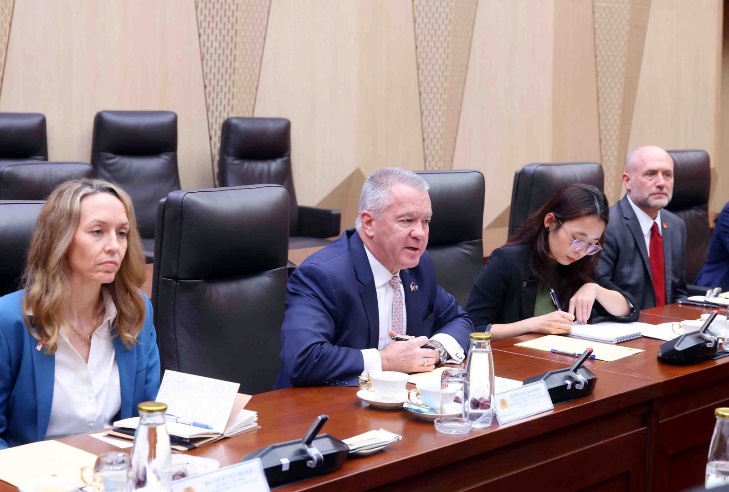 Bộ trưởng Lương Tam Quang điểm lại, tháng 9/2025, Bộ Công an Việt Nam và Bộ Ngoại giao Hoa Kỳ đã đồng chủ trì Đối thoại An ninh, Thực thi pháp luật lần thứ II tại Hoa Kỳ. Bên cạnh đó, hai Bên thường xuyên trao đổi nhiều nội dung thiết thực như phòng chống ma túy, phòng chống mua bán người, nhập cư trái phép, hợp tác về an ninh mạng và chống lừa đảo trực tuyến… Thời gian tới, nhằm tiếp tục thúc đẩy quan hệ song phương và hợp tác chuyên ngành, Bộ trưởng Lương Tam Quang đề nghị Trợ lý Ngoại trưởng Hoa Kỳ Michael G. DeSombre tiếp tục tham mưu triển khai quan hệ Đối tác Chiến lược toàn diện Việt Nam - Hoa Kỳ một cách thực chất hơn nữa, đồng thời nhấn mạnh Bộ Công an Việt Nam mong muốn hai nước sớm hoàn tất đàm phán Hiệp định thương mại đối ứng với kết quả tốt đẹp.