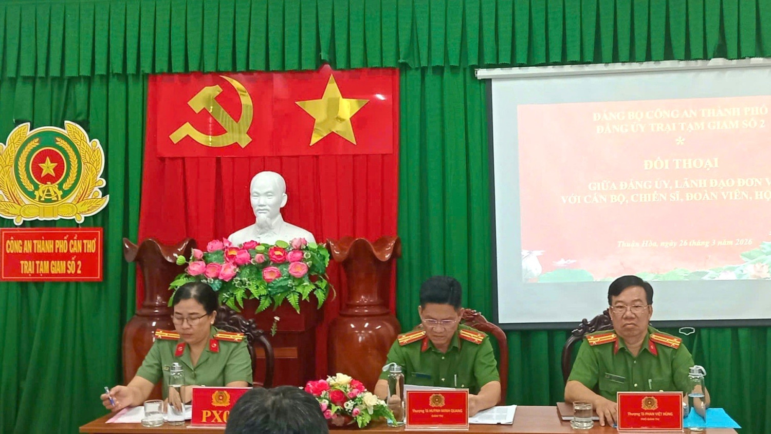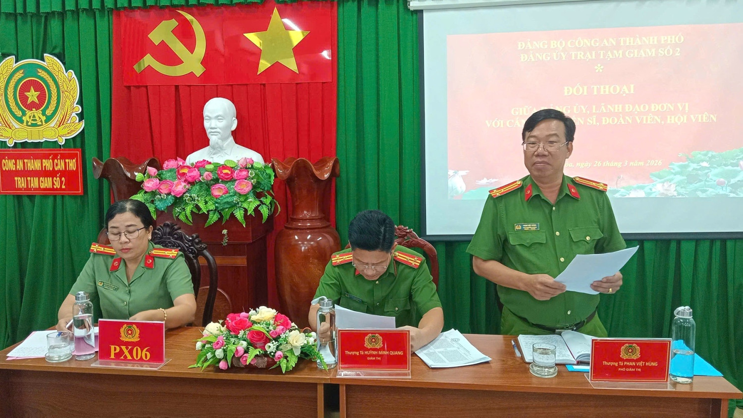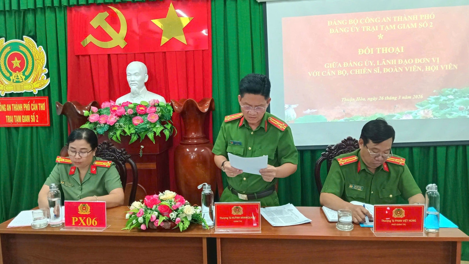 Phát biểu kết luận, Thượng tá Huỳnh Minh Quang, Bí thư Đảng ủy, Giám thị Trại tạm giam số 2 khẳng định, đối thoại là diễn đàn dân chủ, là nơi bày tỏ tâm tư, nguyện vọng, phát huy tinh thần sáng tạo. Qua đó, giúp tăng cường sự gắn kết, thấu hiểu giữa Cấp ủy, lãnh đạo đơn vị với cán bộ, chiến sĩ, đoàn viên, thanh niên. Đồng chí Giám thị Trại tạm giam số 2 mong muốn trong thời gian tới, mỗi cán bộ, chiến sĩ, đoàn viên, thanh niên tiếp tục phát huy tinh thần xung kích, sáng tạo của tuổi trẻ, dám đổi mới, dám nghĩ, dám làm, dám chịu trách nhiệm. Song song đó, tích cực đẩy mạnh thực hiện phong trào thi đua “Ba Nhất: Kỷ luật nhất - Trung thành nhất - Gần dân nhất”, mạnh dạn đảm nhận những việc khó, việc mới, góp phần nâng cao chất lượng, hiệu quả trong thực hiện nhiệm vụ chính trị của toàn đơn vị. Cấp ủy, lãnh đạo sẽ luôn quan tâm, tạo điều kiện thuận lợi để cán bộ, chiến sĩ, đoàn viên, thanh niên và tổ chức Đoàn phát huy vai trò nòng cốt, là lực lượng xung kích, đi đầu, xây dựng tập thể Trại tạm giam số 2 liêm chính, kỷ luật, chuyên nghiệp, hiện đại, nhân văn và gần dân. Trại tạm giam số 2 quyết tâm thực hiện hiệu quả khẩu hiệu hành động năm 2026 của toàn lực lượng “Theo lời Bác dạy - Đổi mới tư duy, Nâng cao tri thức - Chính quy, hiện đại - Vì Đảng, Vì dân”, phấn đấu hoàn thành xuất sắc mọi nhiệm vụ được giao./.