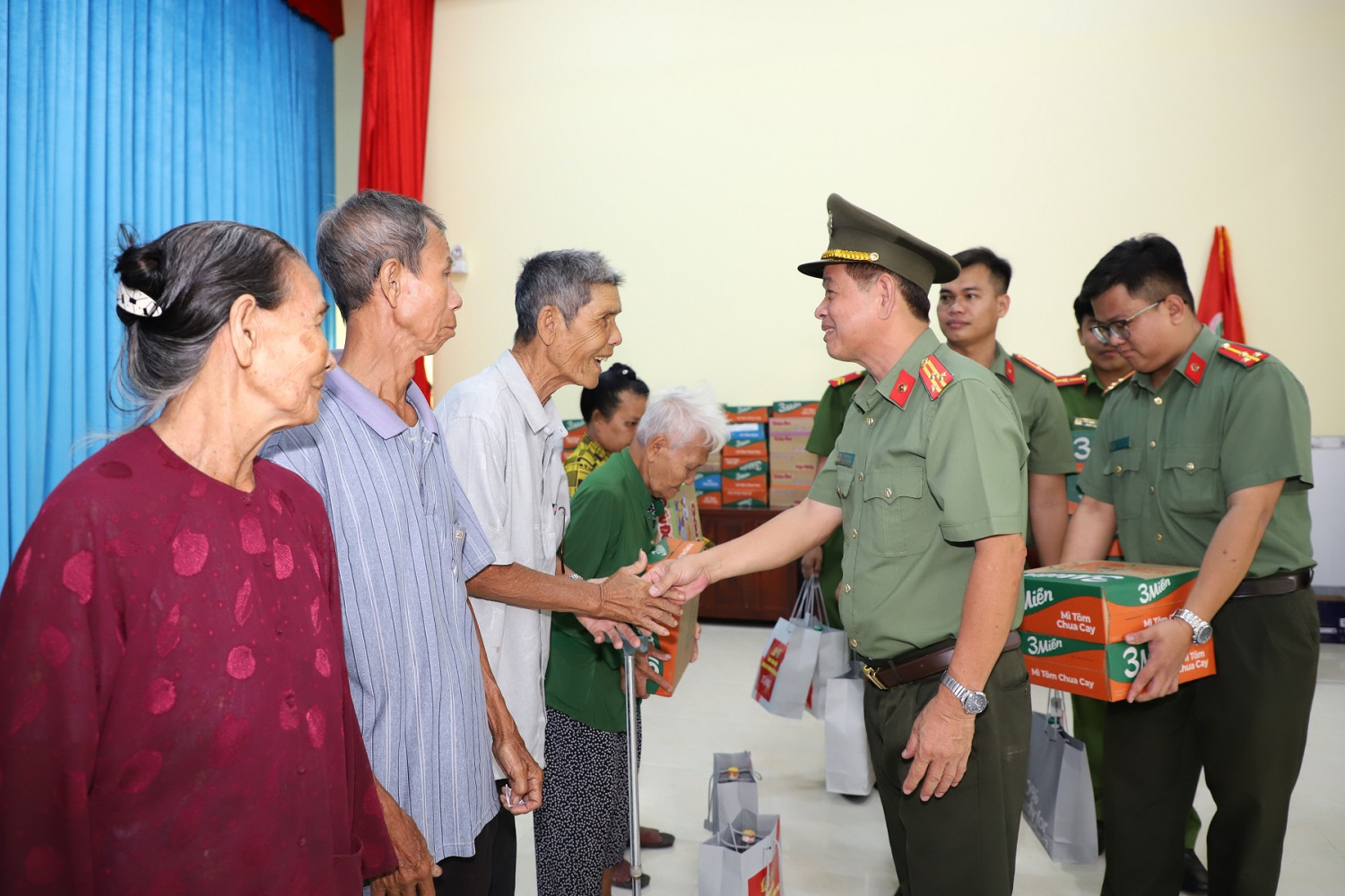 Đại tá Nguyễn Thanh Tràng tặng quà lực lượng tham gia bảo vệ an ninh, trật tự ở cơ sở có hoàn cảnh khó khăn trên địa bàn xã Trần Đề