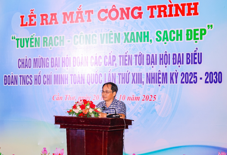 Đại úy Nguyễn Tuấn Ngô, Ủy viên Ban Thường vụ Thành đoàn, Trưởng ban Thanh niên Công an thành phố thông qua Báo cáo thực hiện công trình “Tuyến rạch - Công viên xanh, sạch, đẹp” tại buổi Lễ. Đồng chí cho biết công trình được triển khai trong hơn một tháng (từ ngày 10/9 đến 20/10/2025) trên tuyến Rạch Xẻo Củi, khu vực 3 và khu vực 4, phường Cái Răng, với tổng kinh phí 286 triệu đồng do Nhân dân địa phương và các doanh nghiệp, mạnh thường quân hỗ trợ. Công trình có diện tích khoảng 1.000 m², được lát gạch vỉa hè, lắp dụng cụ thể dục công cộng và đèn chiếu sáng, kết hợp phát quang cỏ dại, trồng hoa súng, cây xanh và thu gom hơn 30 tấn rác thải với trên 1.580 ngày công lao động của đoàn viên, thanh niên và người dân. Đồng chí nhấn mạnh, điểm nổi bật của công trình không chỉ ở diện mạo mới khang trang, sạch đẹp hơn, mà ở ý nghĩa lan tỏa tinh thần sống xanh, hành động xanh, nâng cao ý thức bảo vệ môi trường, tạo sức lan tỏa mạnh mẽ trong cộng đồng. Công trình là minh chứng sinh động cho tinh thần xung kích, tình nguyện và trách nhiệm xã hội của tuổi trẻ Công an thành phố, góp phần gắn kết Nhân dân, xây dựng đô thị Cần Thơ ngày càng văn minh, an toàn, đáng sống.