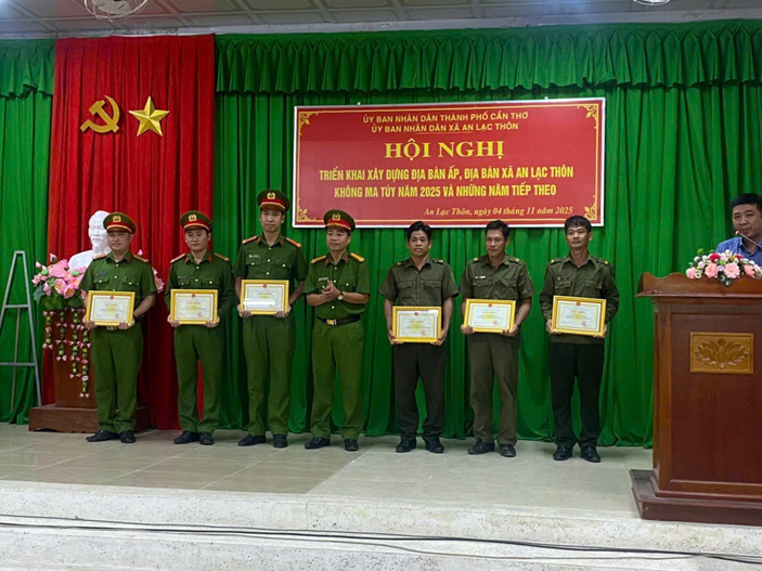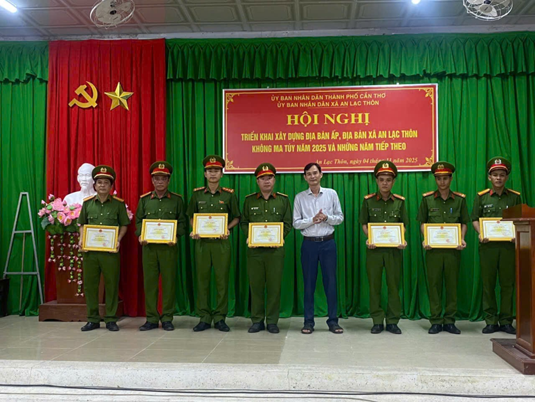 Tại Hội nghị, các đại biểu được triển khai Kế hoạch của Ủy ban nhân dân xã về xây dựng địa bàn ấp, địa bàn xã không ma túy năm 2025 và những năm tiếp theo. Kế hoạch xác định tập trung huy động mọi nguồn lực, chú trọng thực hiện các biện pháp phòng ngừa, đấu tranh, làm sạch ma túy ngay từ cơ sở; lấy phòng ngừa là chính, thực hiện đồng bộ, liên tục, kiên quyết với giải pháp vững chắc, có trọng tâm, trọng điểm; phát huy vai trò của cả hệ thống chính trị và Nhân dân trong công tác đấu tranh phòng, chống ma túy. Phấn đấu trong năm 2025, xã xây dựng thành công 04 ấp không ma túy gồm ấp 2, ấp 12, ấp Hòa Lợi và ấp Phèn Đen; hằng năm tiếp tục xây dựng thêm khoảng 30% số ấp còn lại (tương đương 05 ấp/năm) để đến năm 2028, có 100% địa bàn ấp không ma túy, hoàn thành mục tiêu xây dựng xã An Lạc Thôn không ma túy theo chỉ tiêu Ủy ban nhân dân thành phố giao. Để thực hiện hiệu quả mục tiêu trên, Ủy ban nhân dân xã đã quyết định thành lập Ban Chỉ đạo xây dựng xã An Lạc Thôn không ma túy năm 2025 và những năm tiếp theo, đồng thời thành lập 20 Tổ công tác triển khai xây dựng địa bàn ấp không ma túy. Nhằm động viên, khích lệ tinh thần cán bộ, chiến sĩ Công an xã và lực lượng an ninh, trật tự ở cơ sở, Chủ tịch Ủy ban nhân dân xã đã khen thưởng 14 cá nhân có thành tích xuất sắc trong công tác đấu tranh phòng, chống tội phạm, góp phần bảo đảm an ninh, trật tự trên địa bàn.