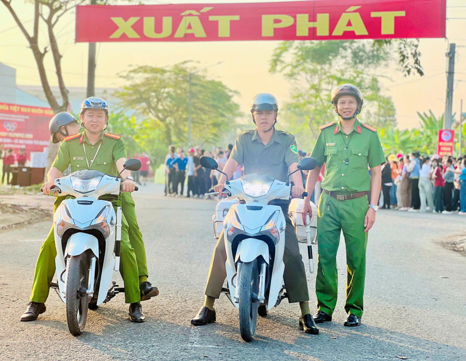 Ảnh: Lực lượng Công an xã Nhơn Ái tích cực trong công tác chuẩn bị và tham gia hoạt động “Ngày chạy Olympic vì sức khoẻ toàn dân” năm 2026