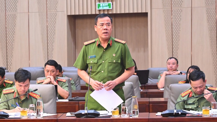 Trung tá Đào Anh Tới, Phó Cục trưởng Cục Pháp chế và cải cách hành chính, tư pháp phát biểu tại cuộc họp.