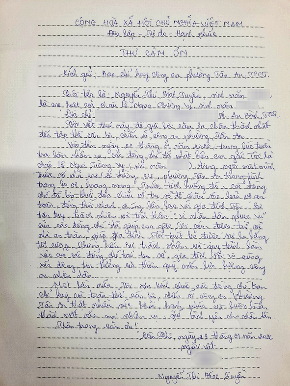 Lá thư cảm ơn chị Tuyền gửi Công an phường Tân An, TP. Cần Thơ