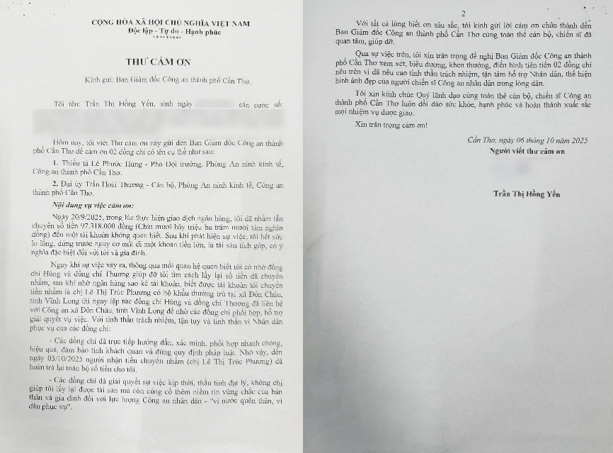 Trong thư cảm ơn gửi đến Ban Giám đốc Công an thành phố Cần Thơ, chị Yến bày tỏ lòng biết ơn sâu sắc trước tinh thần tận tụy, hết lòng vì dân của hai cán bộ Phòng An ninh kinh tế. Chị viết: “Các đồng chí đã giải quyết sự việc kịp thời, thấu tình đạt lý, giúp tôi lấy lại tài sản, đồng thời củng cố thêm niềm tin vững chắc của bản thân và gia đình đối với lực lượng Công an nhân dân, “Vì nước quên thân, vì dân phục vụ”. Hành động tận tâm, trách nhiệm của Thiếu tá Lê Phước Hùng và Đại úy Trần Hoài Thương không chỉ giúp người dân khắc phục hậu quả, bảo vệ tài sản, mà còn lan tỏa hình ảnh đẹp về người chiến sĩ Công an nhân dân gần dân, vì nhân dân phục vụ. Đây là một trong nhiều việc làm cụ thể, thiết thực của Công an thành phố Cần Thơ trong công tác bảo đảm an ninh trật tự, gắn bó mật thiết với Nhân dân, góp phần củng cố niềm tin của người dân đối với lực lượng Công an nhân dân trong thời kỳ mới./.