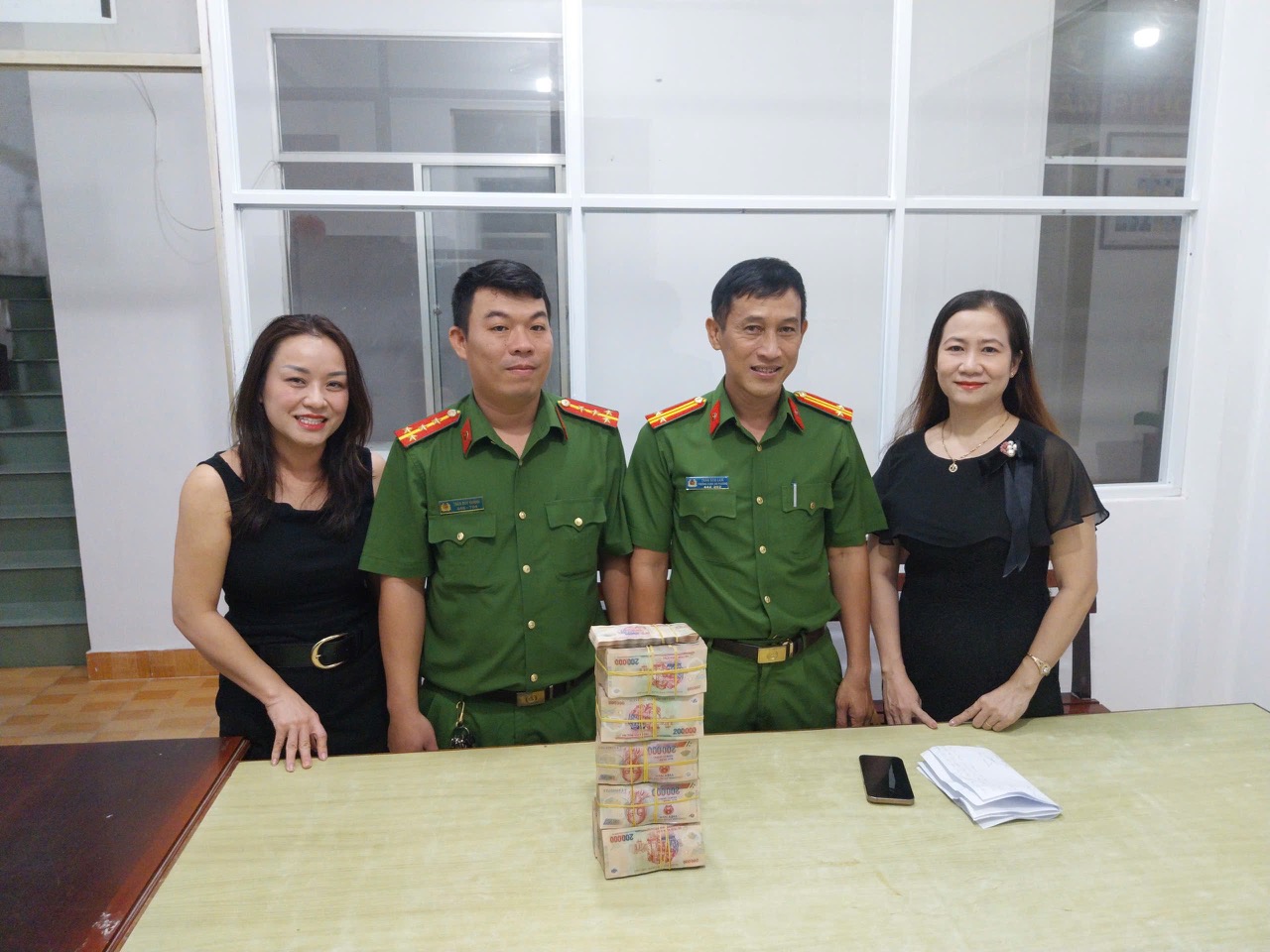 Công an phường Cái Khế chứng kiến chị Thảo (bìa phải), trao lại tiền chuyển nhầm cho chị Hiền (bìa trái).