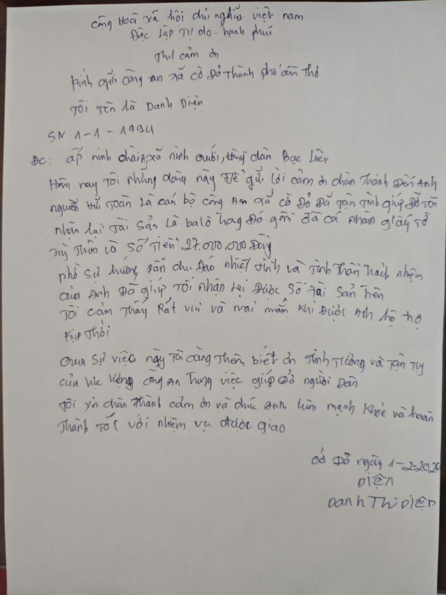 Trước đó, khoảng 10 giờ 30 phút, ngày 31/01/2026 trên tuyến đường Hà Huy Giáp, ấp Thới Thuận, xã Cờ Đỏ, thành phố Cần Thơ, trong quá trình đi công tác, đồng chí Trung úy Nguyễn Hữu Toàn, Cảnh sát khu vực Công an xã Cờ Đỏ đã nhặt được một ba lô màu đen, qua kiểm tra bên trong có đồ dùng cá nhân, giấy tờ tùy thân và số tiền 27.000.000 đồng (Hai mươi bảy triệu đồng).