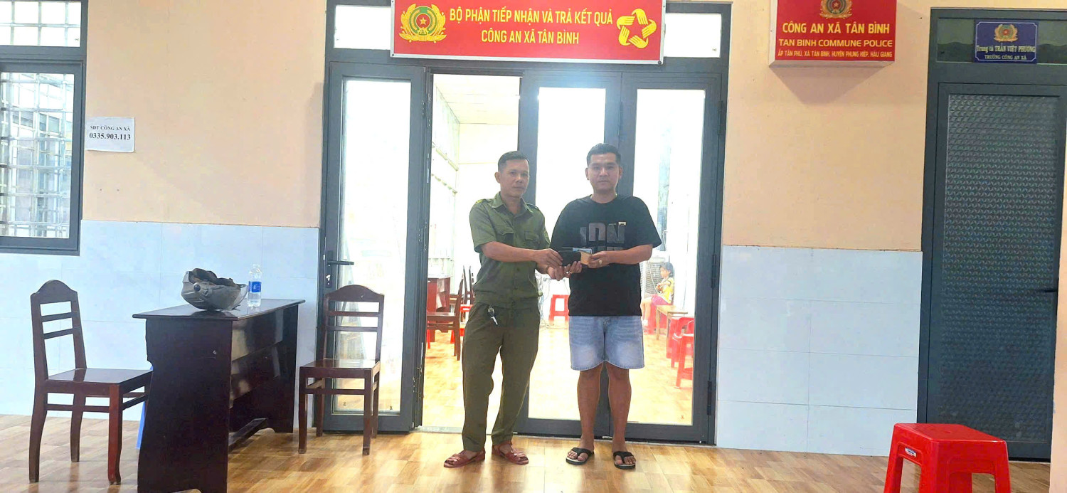 Trước đó, vào tối 06/02/2026, trong quá trình tuần tra khép kín địa bàn, Tổ tuần tra Công an xã Tân Bình phát hiện một chiếc ví bị đánh rơi bên đường. Qua kiểm tra, bên trong có hơn 2.500.000 đồng tiền mặt cùng nhiều giấy tờ tùy thân quan trọng. Xác định đây là tài sản của người dân, đơn vị đã khẩn trương triển khai các biện pháp xác minh, đồng thời thông báo rộng rãi để tìm chủ sở hữu hợp pháp; phối hợp với chính quyền địa phương liên quan nhằm nhanh chóng xác định thông tin người đánh rơi. Đến ngày 07/02/2026, Công an xã Tân Bình đã xác định chủ sở hữu là anh Nguyễn Quốc Công (sinh năm 1998), ngụ xã Đại Hải, thành phố Cần Thơ và mời đến trụ sở Công an xã để nhận lại đầy đủ tài sản gồm tiền mặt và các giấy tờ quan trọng như giấy phép lái xe, thẻ căn cước công dân, thẻ ATM.