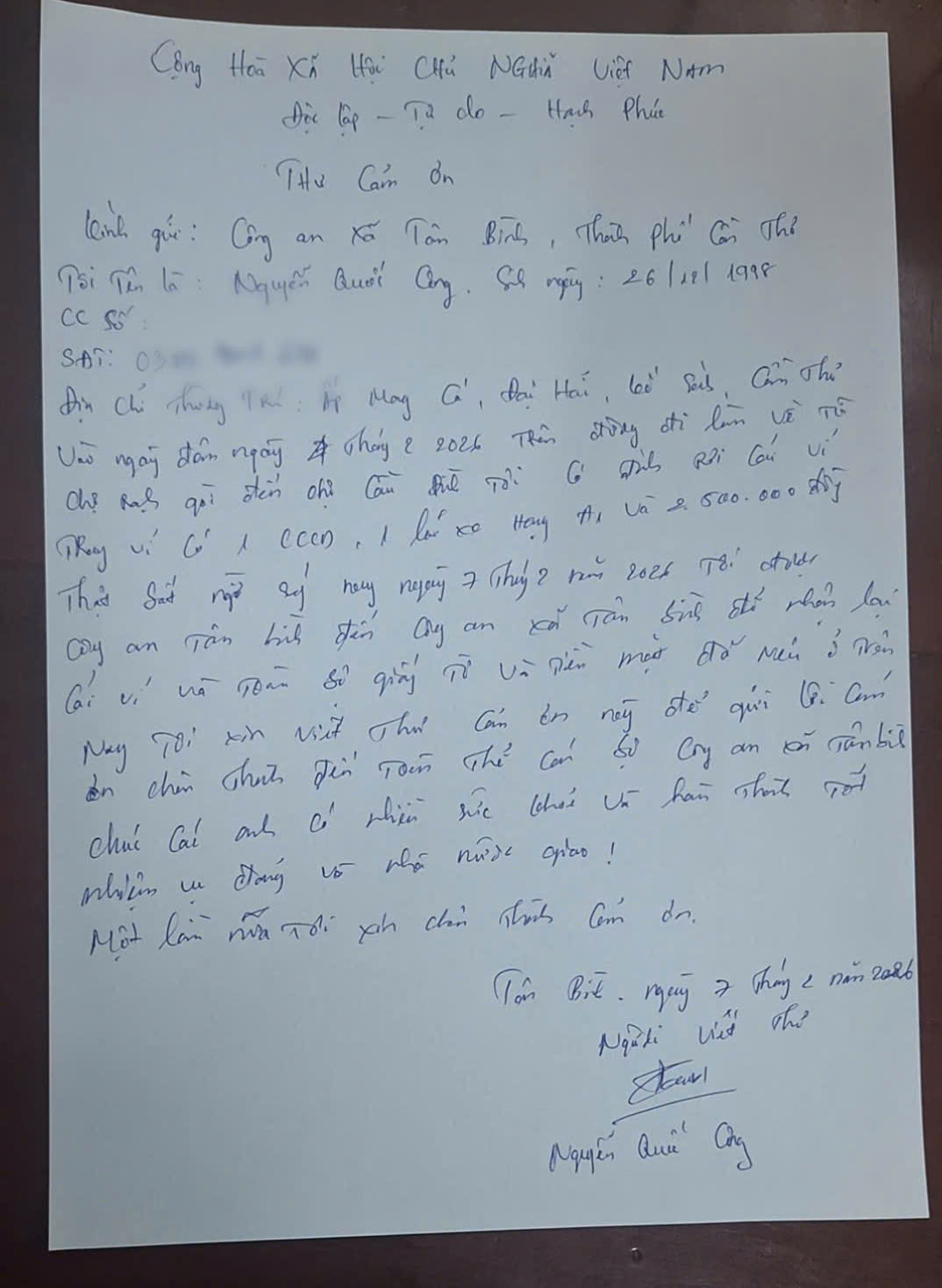 Thư cảm ơn của anh Nguyễn Quốc Công gửi đến tập thể Công an xã Tân Bình