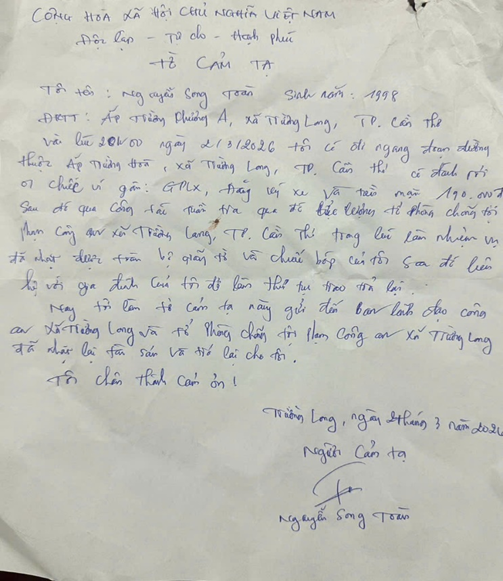Nhận lại chiếc ví cùng đầy đủ giấy tờ và tài sản bên trong, anh Nguyễn Song Toàn rất vui mừng và xúc động. Ngay trong ngày, anh đã viết “Thư cảm tạ” gửi đến Ban Chỉ huy Công an xã Trường Long và Tổ Cảnh sát phòng, chống tội phạm để bày tỏ lòng biết ơn trước tinh thần trách nhiệm, tận tụy của lực lượng làm nhiệm vụ.
