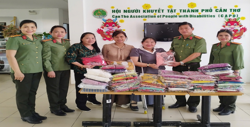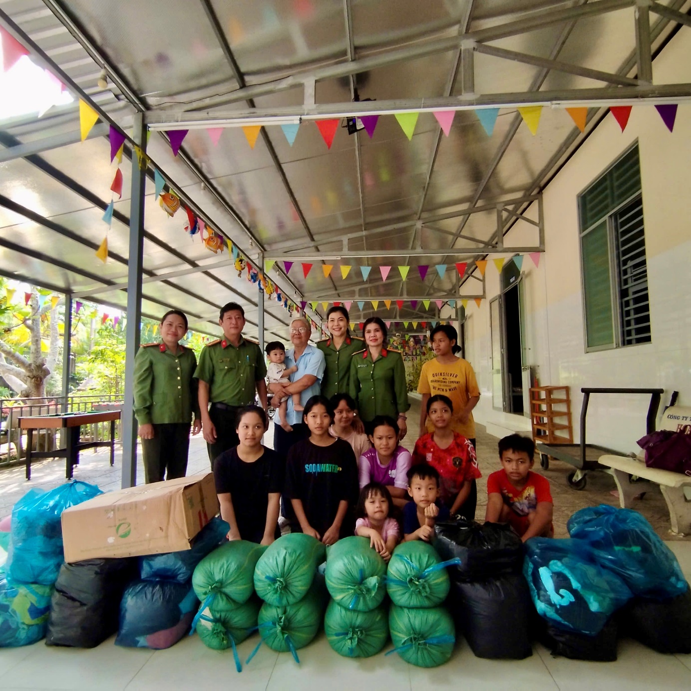 Trung tá Lê Thị Thanh Nga tham gia cùng đoàn công tác của Phòng An ninh đối ngoại, Công an thành phố Cần Thơ đến thăm hỏi và tặng quà cho Hội Bảo trợ Người khuyết tật, Trẻ mồ côi và Bệnh nhân nghèo thành phố Cần Thơ (ảnh trên) và trẻ mồi côi tại Cơ sở bảo trợ xã hội Thiên Ân, thành phố Cần Thơ (ảnh dưới).