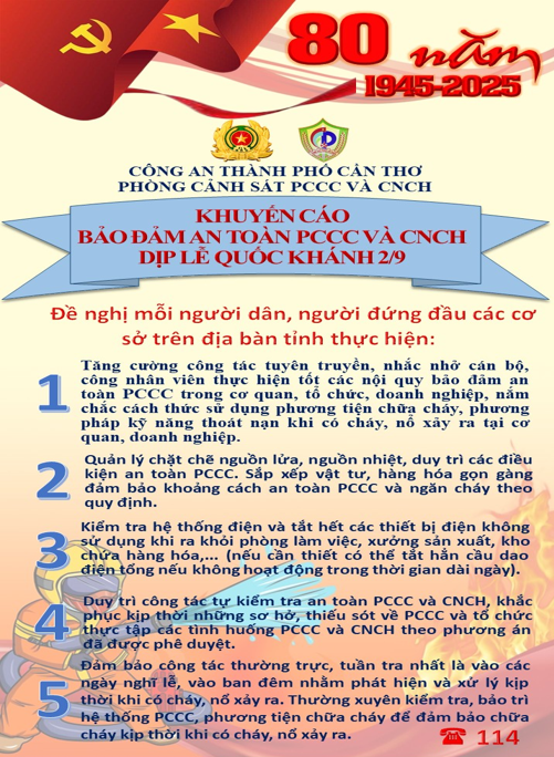 Hòa cùng khí thế cả nước chào mừng kỷ niệm 80 năm Cách mạng Tháng Tám thành công (19/8/1945 - 19/8/2025) và Quốc khánh nước Cộng hòa xã hội chủ nghĩa Việt Nam (02/9/1945 - 02/9/2025), nhằm bảo đảm an ninh, trật tự, an toàn phòng cháy, chữa cháy và cứu nạn, cứu hộ (PCCC và CNCH); đồng thời nâng cao ý thức, tinh thần chủ động phòng ngừa, chấp hành nghiêm các quy định về PCCC trong dịp Đại lễ, Công an thành phố Cần Thơ khuyến cáo mỗi người dân, người đứng đầu cơ quan, đơn vị, cơ sở trên địa bàn thực hiện tốt các biện pháp sau: