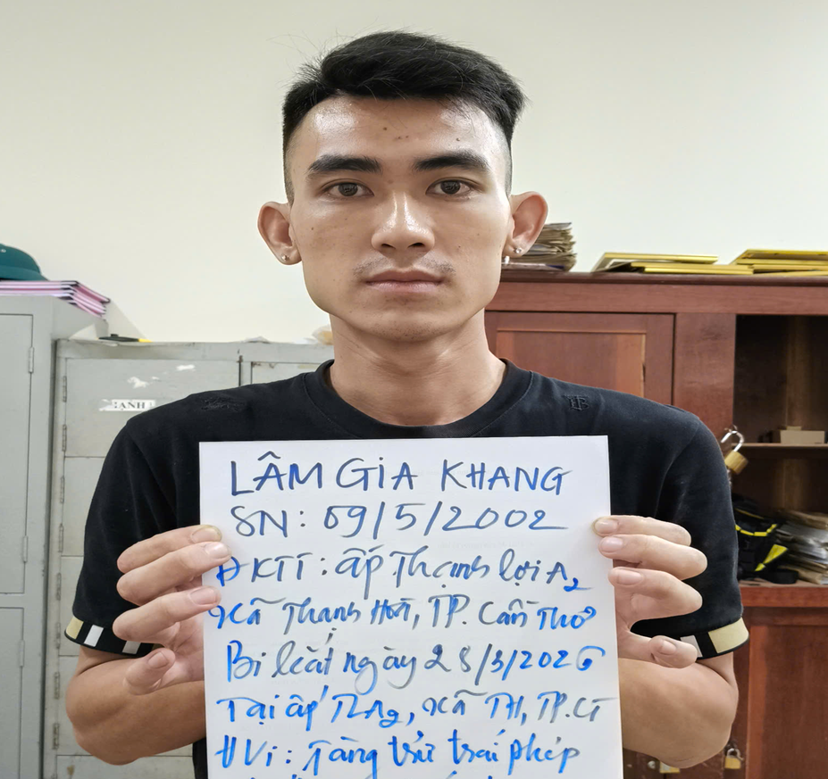 Theo đó, vào khoảng 23 giờ 30 phút ngày 28/3/2026, Công an xã Thạnh Hòa nhận được tin tố giác của quần chúng nhân dân tại khu vực gần cây xăng 89, thuộc ấp Thạnh Lợi A2, xã Thạnh Hòa, TP. Cần Thơ có một thanh niên biểu hiện lén lút, nghi vấn sử dụng trái phép chất ma túy. Sau khi tiếp nhận, Công an xã phân công lực lượng tiến hành xác minh tin báo, đồng thời chỉ đạo Tổ tuần tra bảo đảm an ninh, trật tự kiểm tra đối tượng L.G.K (sinh năm 2002, trú tại ấp Thạnh Lợi A2, xã Thạnh Hòa, TP. Cần Thơ), là đối tượng thuộc diện quản lý về ma túy trên địa bàn, có biểu hiện nghi vấn liên quan đến hành vi sử dụng trái phép chất ma túy. Xét thấy có khả năng đối tượng còn cất giấu ma túy trong người, Công an xã ra lệnh khám xét người trong trường hợp khẩn cấp đối với L.G.K.