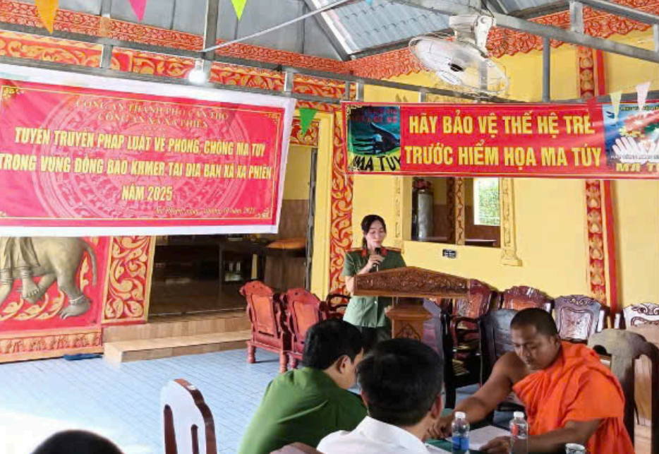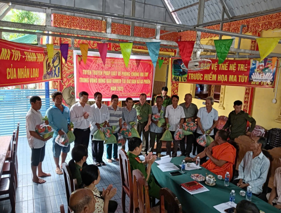 Bên cạnh đó, tại xã Xà Phiên, Công an xã đã chọn chùa Pô Thi Wone Wong Sa Kai Rone (ấp Ngã Bác) làm điểm phát động tuyên truyền pháp luật phòng, chống ma túy trong vùng đồng bào Khmer. Buổi tuyên truyền thu hút đông đảo Phật tử tham dự, giúp bà con hiểu rõ hơn về tác hại của ma túy, các quy định của pháp luật, qua đó nâng cao ý thức phòng ngừa, tố giác tội phạm, góp phần xây dựng địa bàn “không ma túy”, giữ vững an ninh, trật tự tại cơ sở.