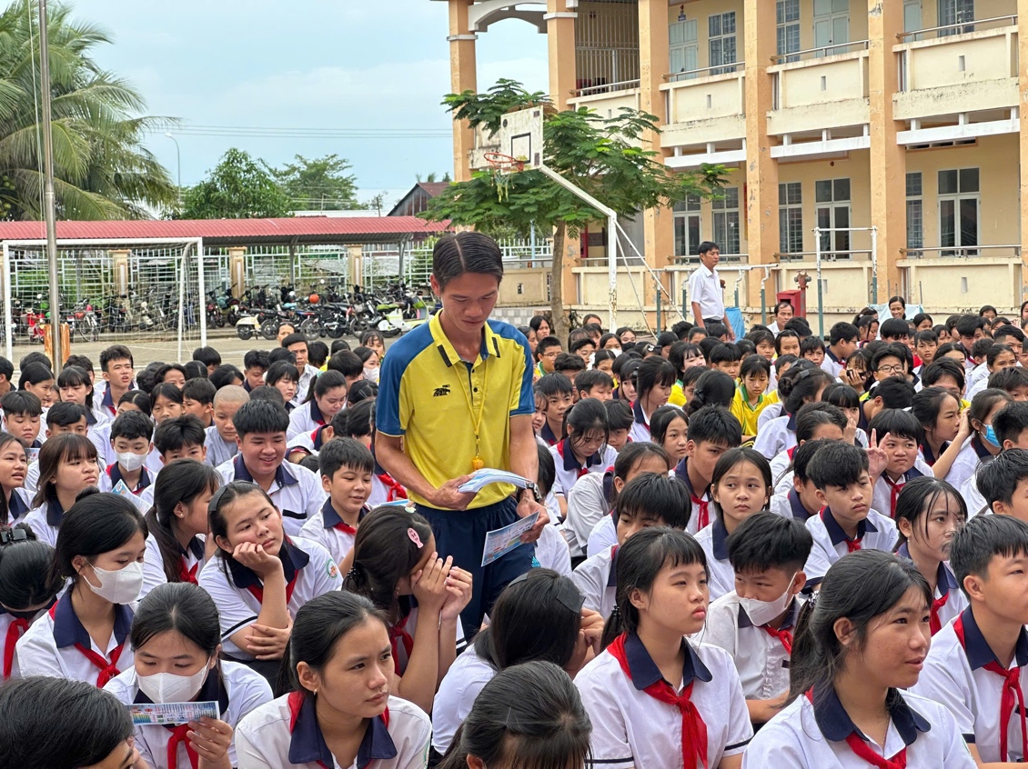 Cán bộ Công an xã Thạnh Quới phối hợp giáo viên nhà trường trên địa bàn xã phát tờ rơi tuyên truyền phổ biến pháp luật về phòng, chống ma túy