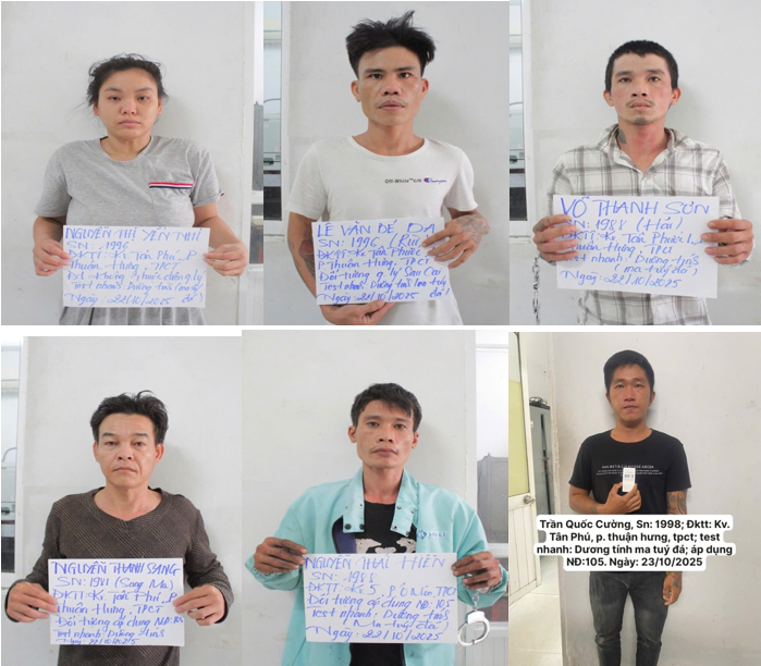 Ngày 22/10/2025, qua công tác nắm tình hình, Công an phường Thuận Hưng, thành phố Cần Thơ phát hiện 01 nhóm đối tượng có biểu hiện nghi vấn tụ tập tại một địa điểm trên địa bàn khu vực Tân Phú, phường Thuận Hưng. Tiến hành kiểm tra, lực lượng Công an bắt quả tang 04 đối tượng có hành vi mua bán, tàng trữ, tổ chức sử dụng và sử dụng trái phép chất ma túy, thu giữ nhiều tang vật gồm 2 túi tinh thể màu trắng nghi là ma túy đá, 2 bộ dụng cụ sử dụng ma túy, 67 nỏ thủy tinh và 20 dụng cụ sang chiết, chia nhỏ ma túy. Mở rộng điều tra, Công an phường tiếp tục bắt thêm 5 đối tượng có liên quan, thu giữ thêm ma túy đá, nâng tổng số 9 đối tượng bị phát hiện, bắt giữ. Kết quả giám định xác định tổng khối lượng ma túy là 0,6265 gam. Hiện, Công an phường Thuận Hưng đã ra quyết định giữ người trong trường hợp khẩn cấp đối với 03 đối tượng để điều tra theo quy định; đưa 01 đối tượng đi cai nghiện bắt buộc, khởi tố 01 đối tượng thuộc diện quản lý sau cai và lập hồ sơ xử lý 04 đối tượng khác theo Nghị định 105/NĐ-CP của Chính phủ.