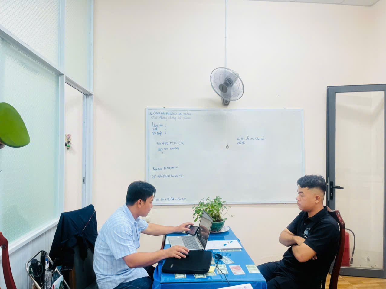Đối tượng trộm cắp tài sản (áo đen, bên phải) tại cơ quan Công an