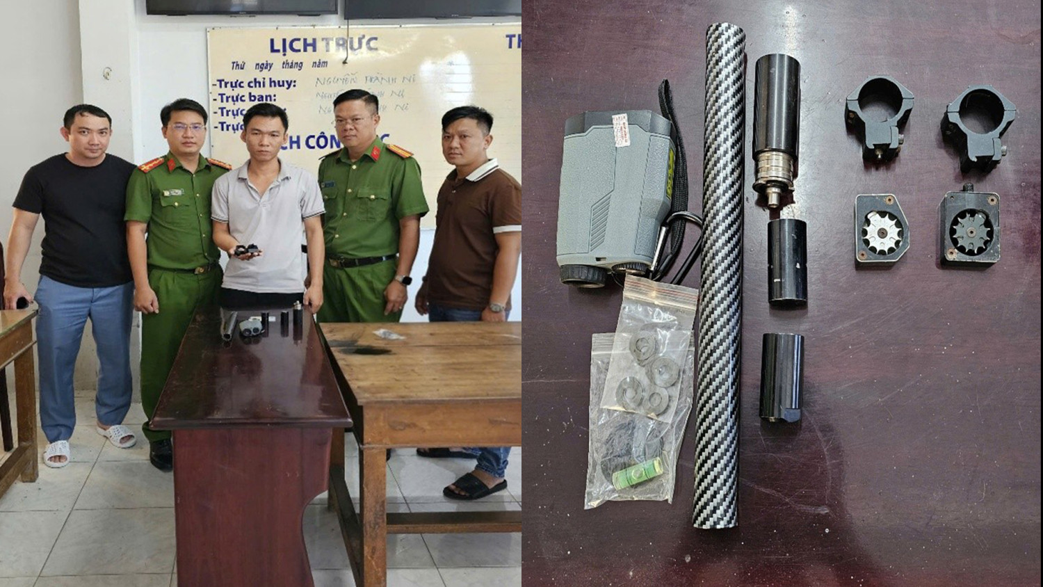 Phòng Cảnh sát Quản lý hành chính về trật tự xã hội bắt đối tượng Đặng Quốc Thiện (đứng giữa) có hành vi đăng tải trên mạng xã hội rao bán linh kiện súng trái phép