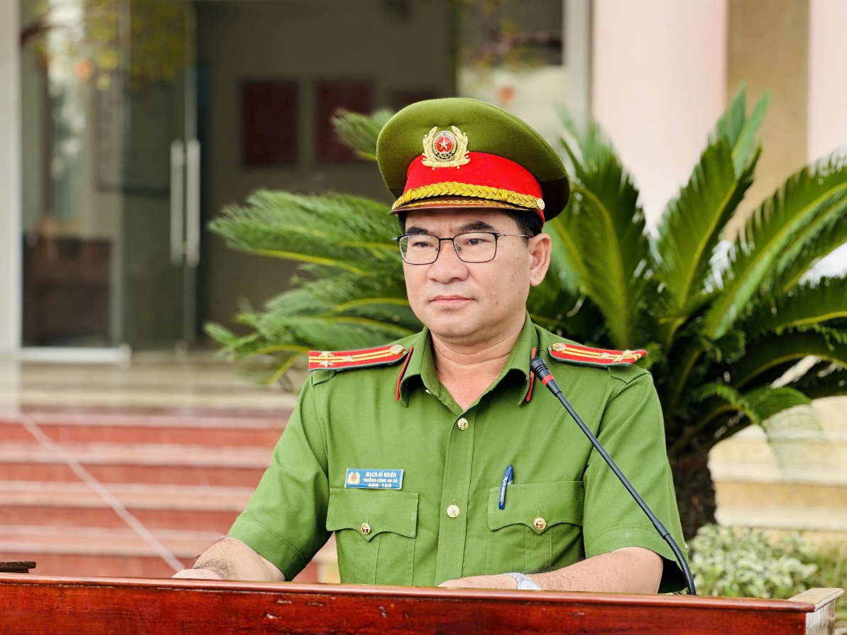 Thượng tá Mạch Dĩ Nhiên, Trưởng Công an xã Mỹ Tú phát biểu tại Lễ ra quân