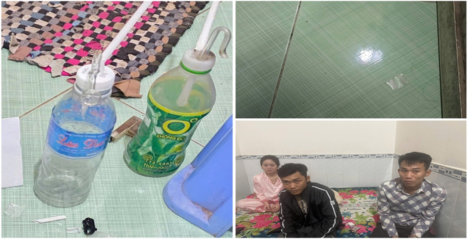 Tại hiện trường, lực lượng Công an thu giữ 03 túi nylon bên trong chứa chất tinh thể màu trắng; 02 bộ dụng cụ dùng sử dụng ma túy và 01 đoạn ống nhựa màu trắng được hàn kín một đầu.