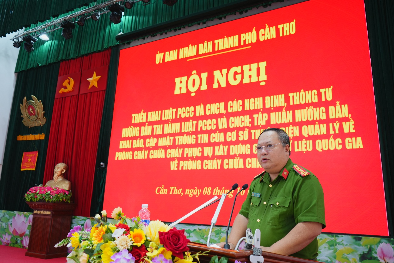 Sáng ngày 8/10, Công an TP Cần Thơ phối hợp với Ủy ban nhân dân thành phố tổ chức Hội nghị triển khai Luật Phòng cháy, chữa cháy và cứu nạn, cứu hộ (PCCC & CNCH); các Nghị định, Thông tư hướng dẫn thi hành Luật; đồng thời tập huấn hướng dẫn khai báo, cập nhật thông tin của các cơ sở thuộc diện quản lý về PCCC & CNCH. Dự và chỉ đạo Hội nghị có Đại tá Lê Đức Bảy, Ủy viên Ban Thường vụ Đảng ủy, Phó Giám đốc Công an thành phố; cùng dự có Đại tá Hoàng Ngọc Huynh, Phó Cục trưởng Cục Cảnh sát PCCC & CNCH; lãnh đạo, chỉ huy Phòng Cảnh sát PCCC & CNCH, Công an thành phố và đại diện lãnh đạo các sở, ban, ngành, Ủy ban nhân dân cấp xã trên địa bàn.