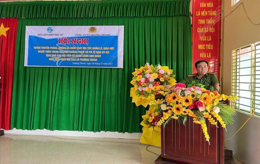 Tại xã Trường Thành, ngày 26/12/2025, Công an xã đã phối hợp Hội Liên hiệp Phụ nữ xã tổ chức tuyên truyền, triển khai Chỉ thị đến cán bộ, hội viên và Nhân dân trên địa bàn, với sự tham dự của khoảng 150 đại biểu. Thông qua tuyên truyền trực tiếp, lực lượng Công an xã đã cung cấp thông tin về tình hình tội phạm và tệ nạn ma túy, phương thức, thủ đoạn hoạt động của các đối tượng; đồng thời hướng dẫn kỹ năng nhận biết, tố giác tội phạm, quản lý, giáo dục người thân trong gia đình. Hoạt động đã góp phần nâng cao ý thức tự phòng, tự quản của Nhân dân; qua đó, Công an xã phối hợp trao tặng 30 phần quà cho hội viên phụ nữ có hoàn cảnh khó khăn, thể hiện tính nhân văn, góp phần củng cố niềm tin của Nhân dân đối với lực lượng Công an.