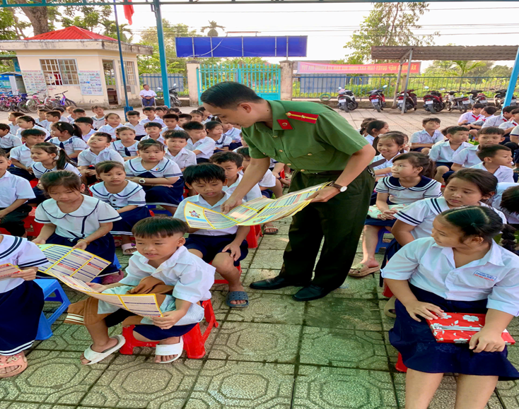 Cán bộ Công an xã Phụng Hiệp tuyên truyền phòng, chống ma túy và trật tự, an toàn giao thông tại Trường Tiểu học Phụng Hiệp.