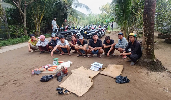 Các đối tượng và tang vật thu được tại hiện trường ấp Phước Thới A, xã Mỹ Phước.