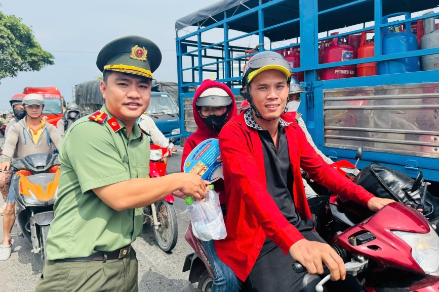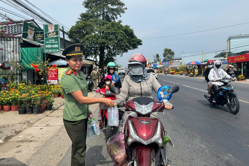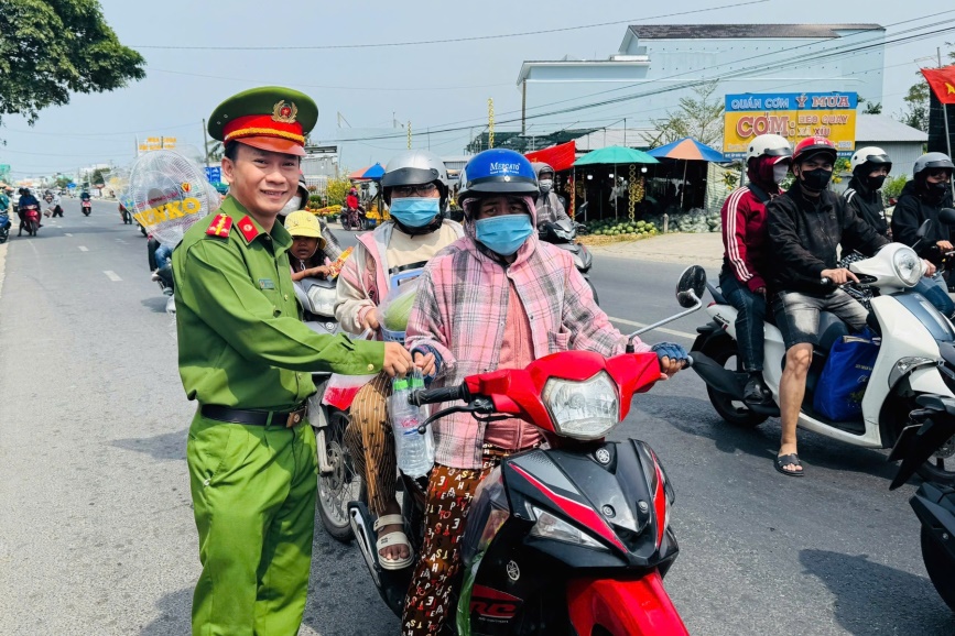 Công an xã Nhu Gia trao nước suối, khăn lạnh cho người dân về quê đón Tết