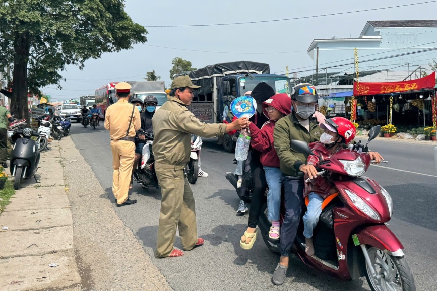 Lực lượng Công an xã Nhu Gia, Trạm Cảnh sát giao thông Mỹ Xuyên và lực lượng tham gia bảo vệ ANTT cơ sở trao nước suối, khăn lạnh và trao tặng quạt in thông điệp bảo đảm trật tự, an toàn giao thông