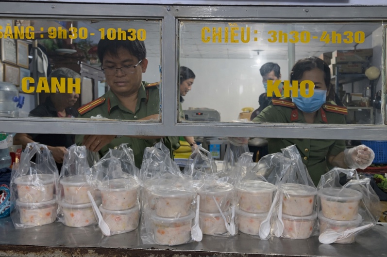 Thiếu tá Phan Thanh Chí, Phó Giám đốc Trung tâm Thông tin chỉ huy, Phòng Tham mưu Công an thành phố Cần Thơ (bên trái) cùng cán bộ, chiến sĩ chuẩn bị các suất cháo trao tặng người bệnh và thân nhân nuôi bệnh.